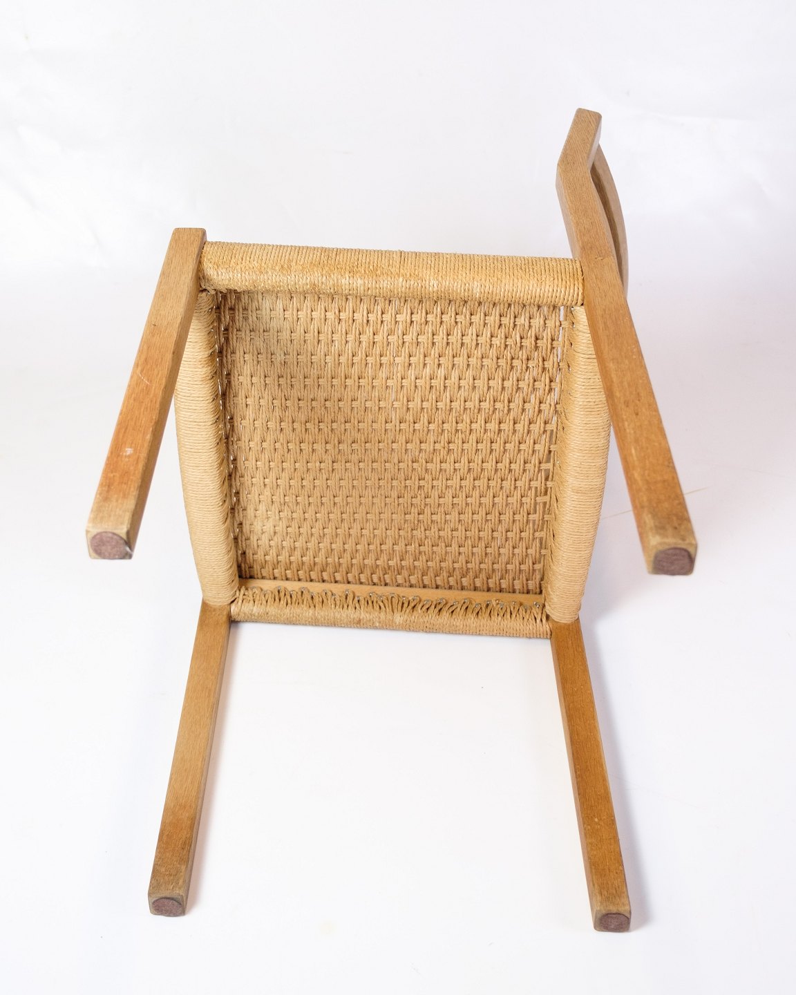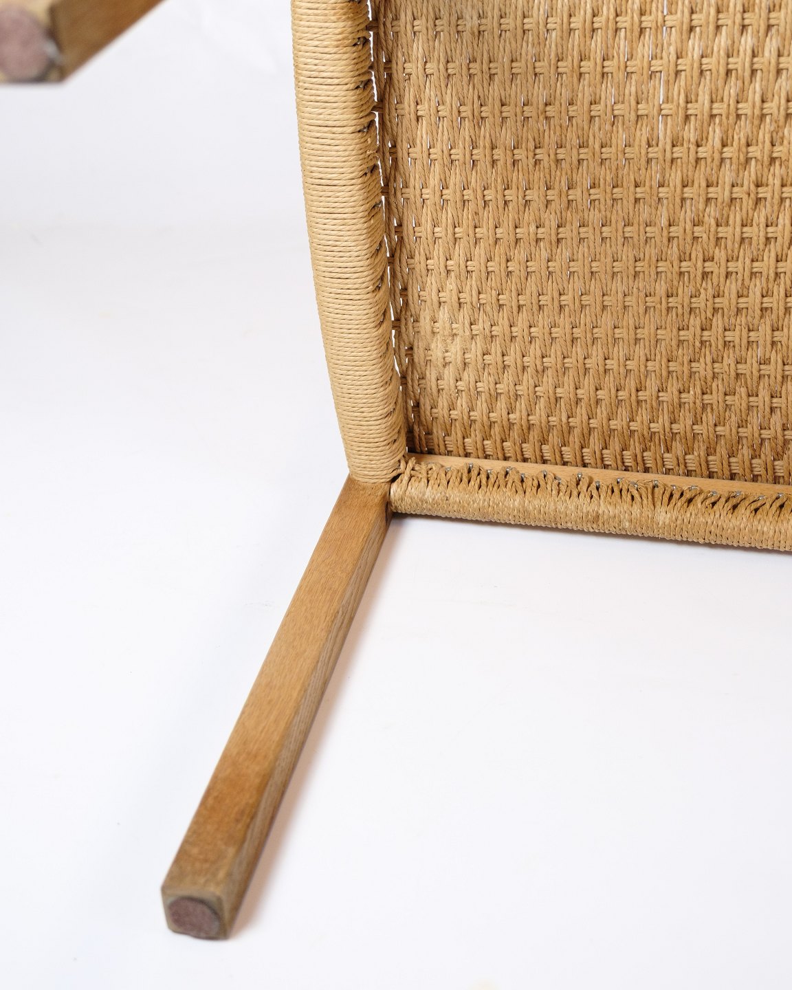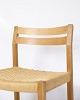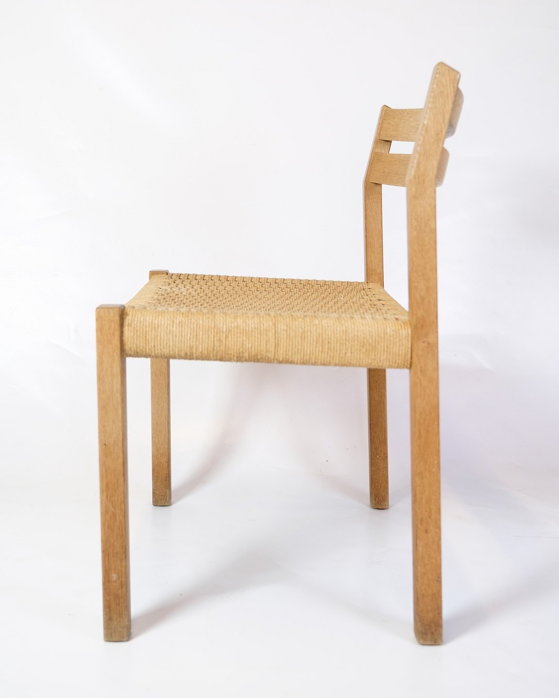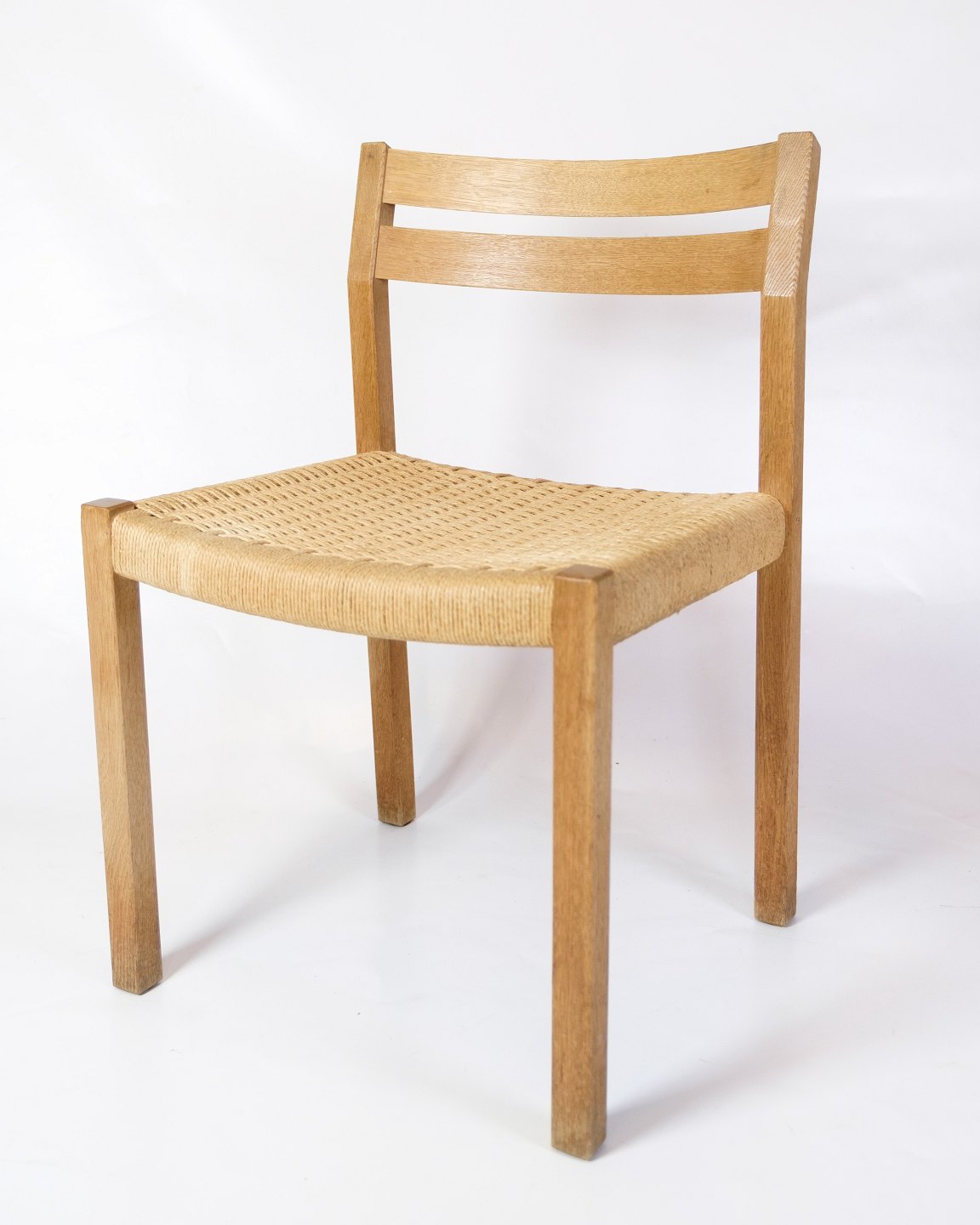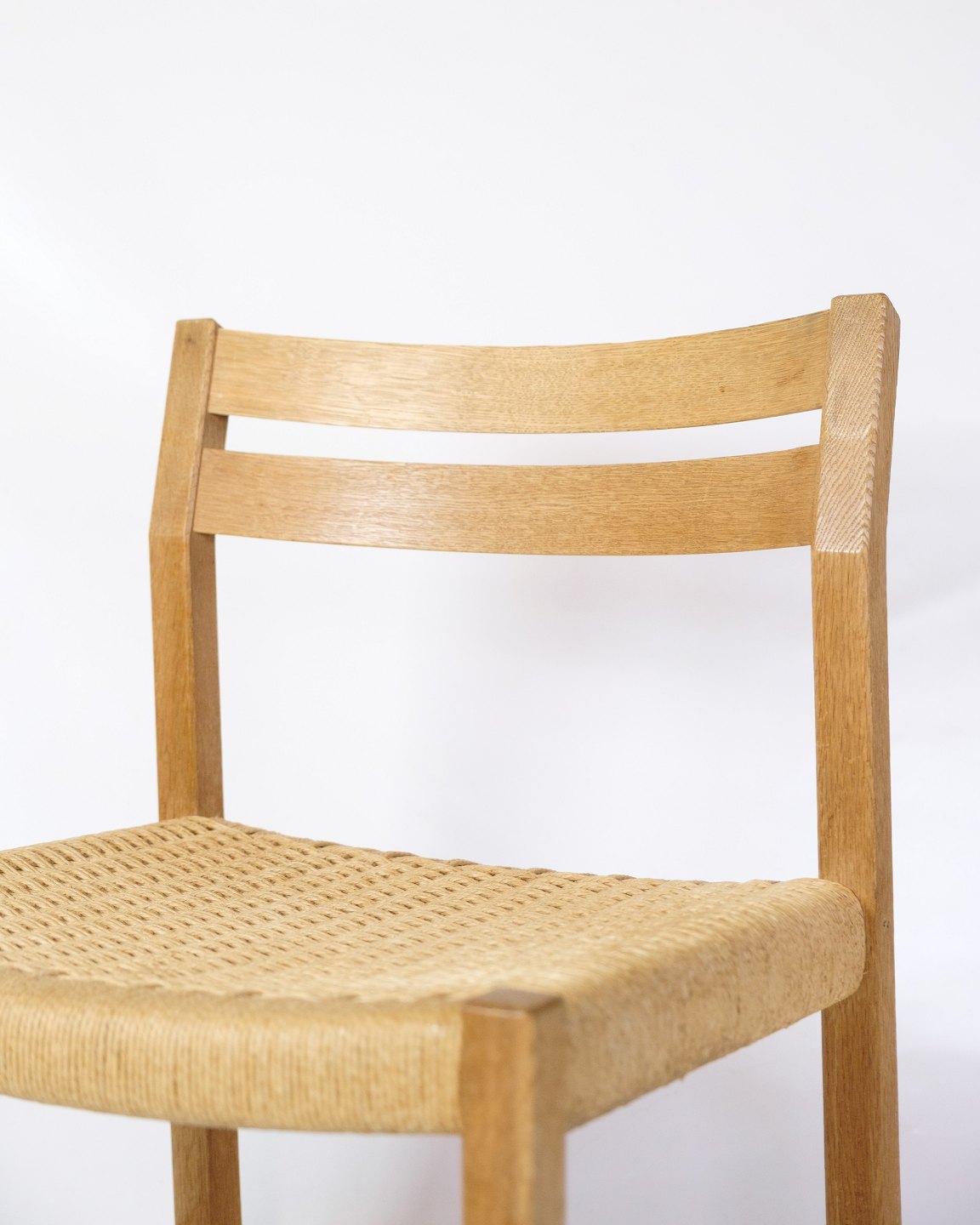 Set of five dining chairs, model 401, designed by Jørgen Henrik Møller for JL Møllers Møbelfabrik in the 1960s. Made of solid oak with hand-woven flat wicker seats. Classic Danish furniture design with a focus on quality and craftsmanship. The chairs are in very good condition.