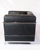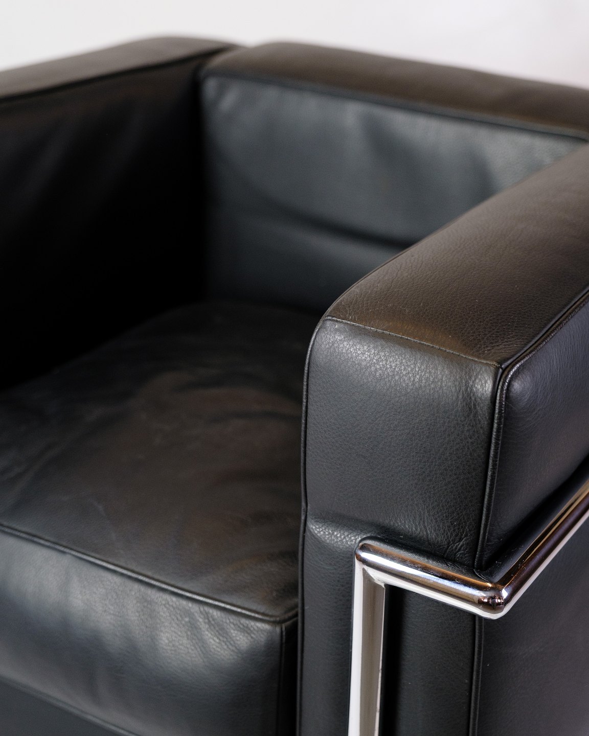 Le Corbusier LC2 lænestol, designet i 1928 af Le Corbusier, Pierre Jeanneret og Charlotte Perriand, produceret af Cassina. Stolen har en ramme i forkromet stålrør og polstring i sort læder.