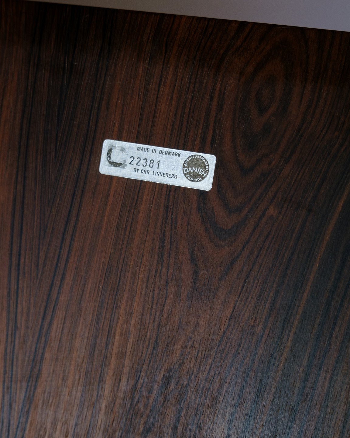 Spisebord med udtræk i palisander, designet af Johannes Andersen og produceret af Chr. Linnebergs Møbelfabrik i 1960’erne. Bordet har integreret udtræk skjult i sargen for et elegant og sammenhængende udtryk. Johannes Andersen (1903–1991) er kendt for sit organiske formsprog og brug af ædle materialer. Et klassisk eksempel på dansk mid-century design.