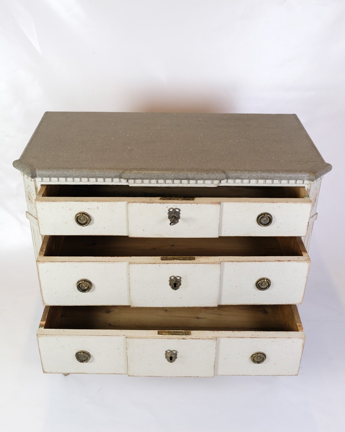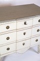 Gustavian chest of drawers from the 1840s with three drawers, painted grey in a classic style. Top made of marbled wood, giving an elegant expression. Swedish origin with period carvings and details. An authentic piece of furniture with both function and decorative value.