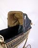 Antik barnevogn fra omkring år 1900 med flettet kurv og original kaleche. Vognen står på et smukt buet metalstel med store egerhjul og hvide håndtag. Klassisk og dekorativ barnevogn, ideel som samlerobjekt eller vintage indretning.