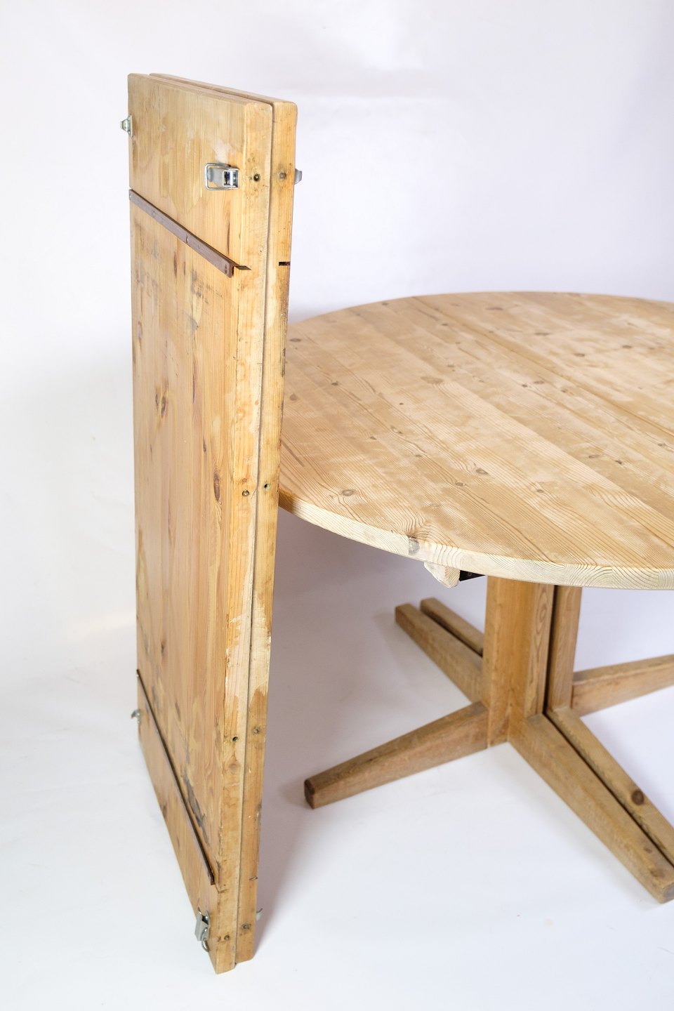 SoldRound dining table with extension in solid pine from the 1970s. Made with a three-legged frame and natural surface. The table comes with two extension leaves that provide extra space as needed. A solid and functional table with classic 70s design.