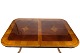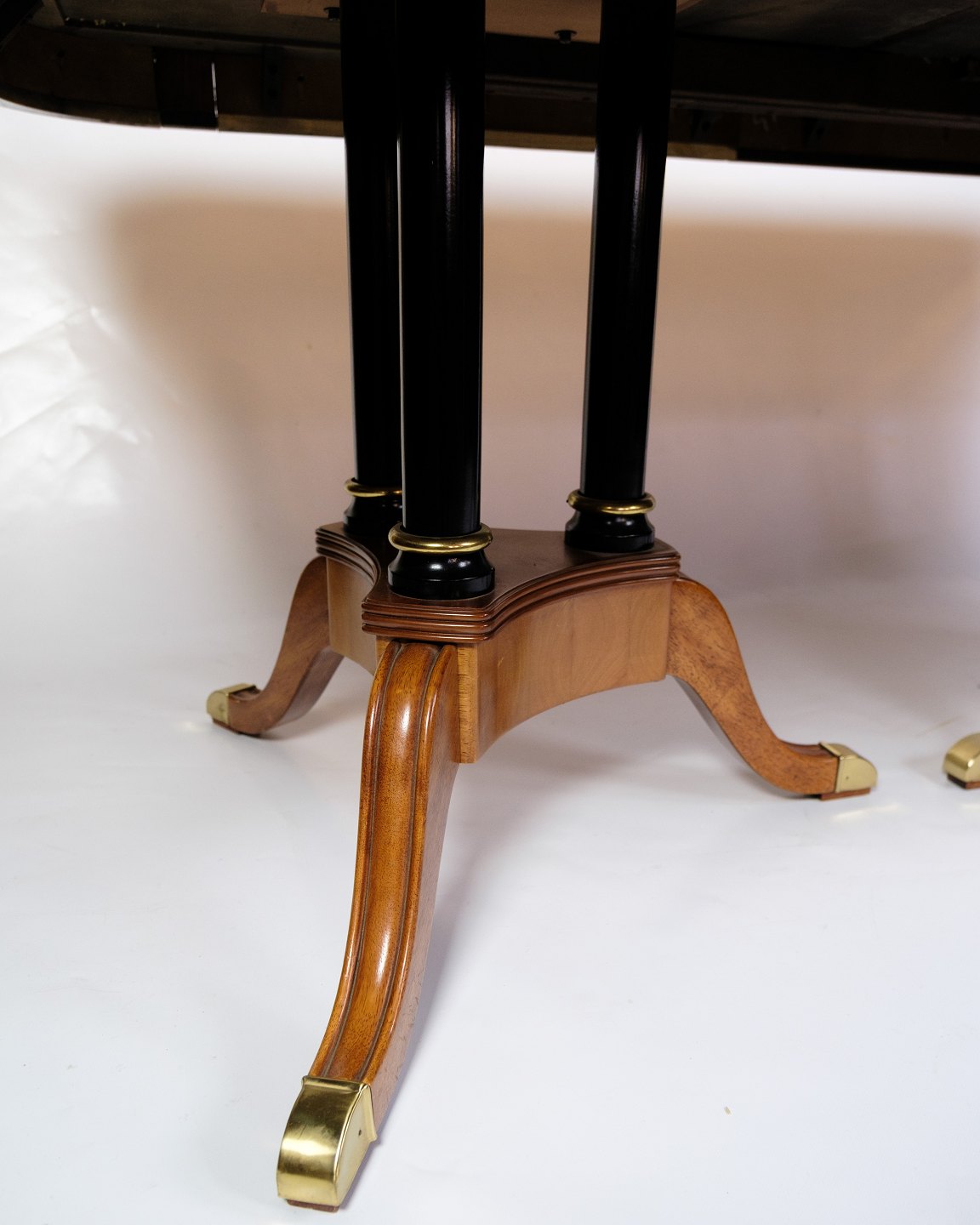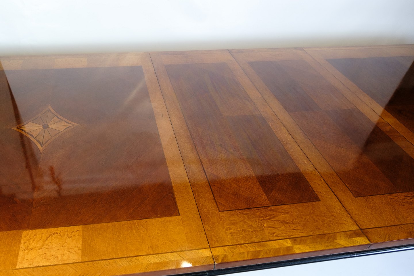 Dining table in veneered mahogany with decorative inlay panels and birch edging. The tabletop has a symmetrically arranged inlay decoration in the middle and rounded corners, which emphasize the classic expression. The frame consists of two elegant column legs with curved feet finished with brass caps, which gives the table stability and a refined expression.