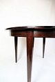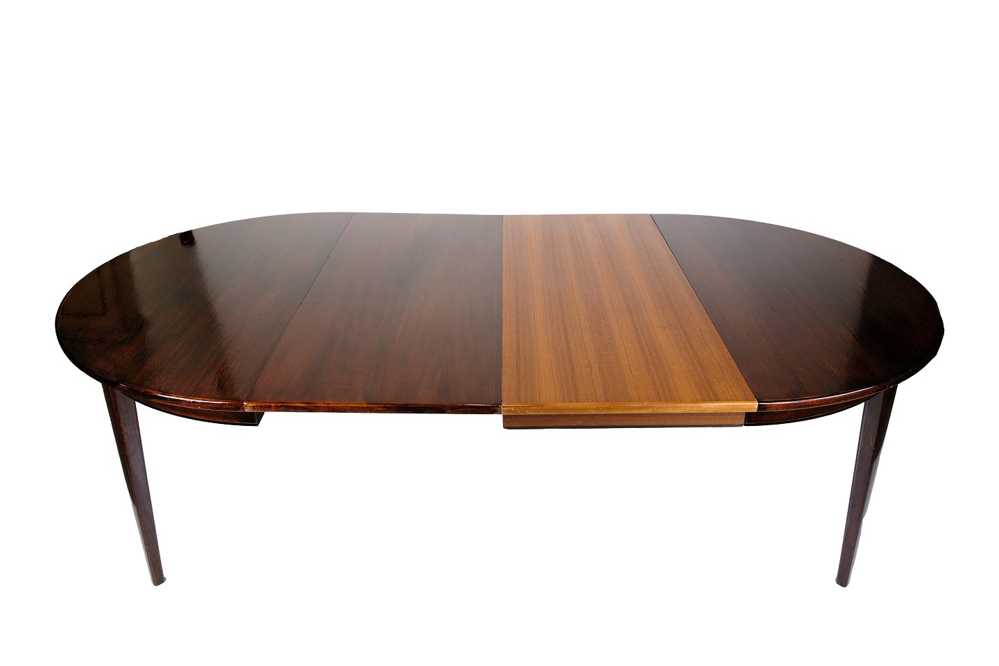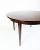 Round dining table, model 55, designed by Omann Junior in the 1960s. Made of mahogany with classic Danish design and focus on solid craftsmanship. The table comes with three extension leaves, which allows for flexible expansion, perfect for both everyday use and larger gatherings.