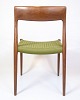 Six dining chairs designed by Niels O. Møller in the 1960s. Model 77 is made of teak with seats in green paper wicker. The chair's simple lines and curved backrest provide good seating comfort and a clear design language that has made Møller's design a permanent part of Danish furniture history. A solid choice for both classic and modern interiors.