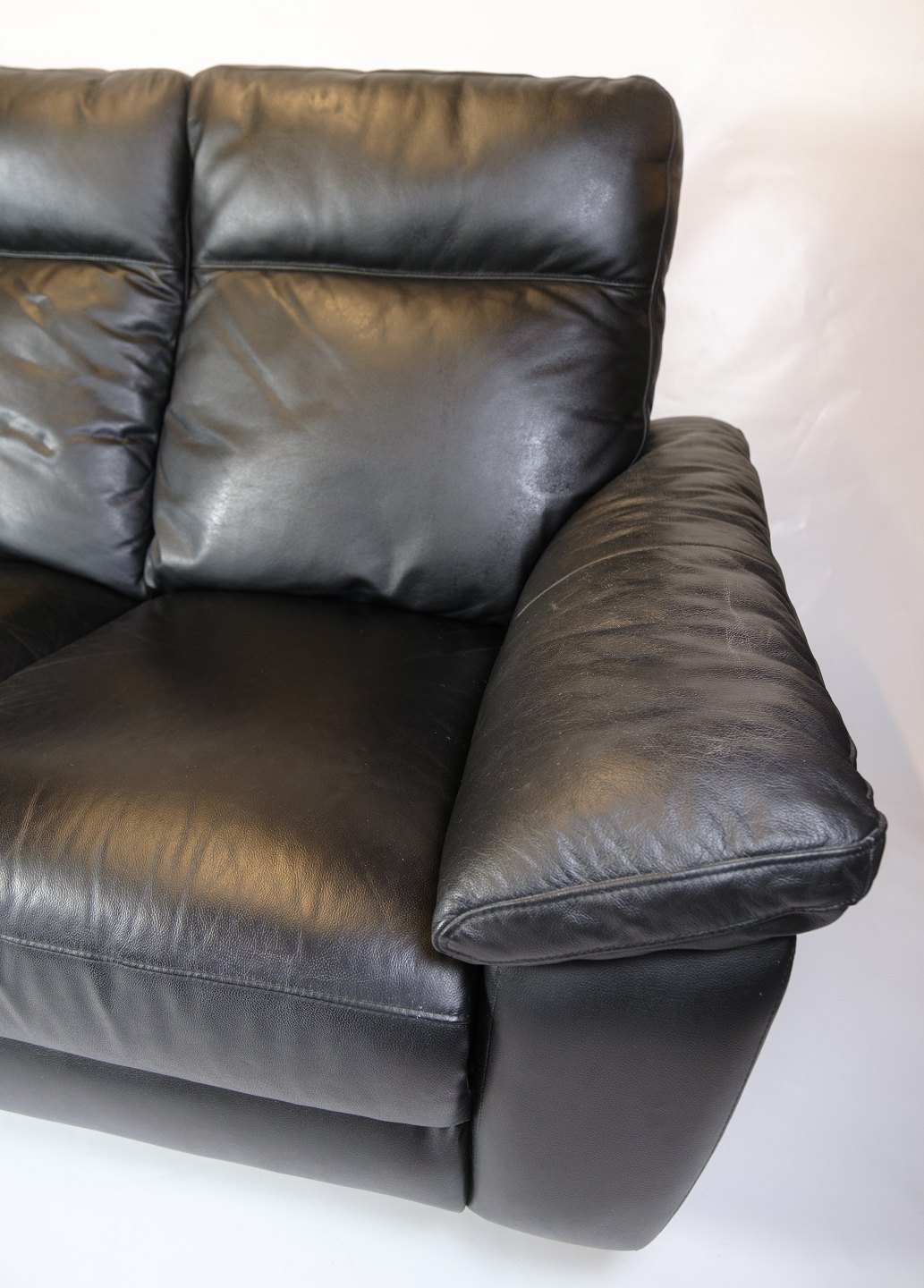 3-seater sofa made of black leather. The sofa is equipped with an adjustable backrest and legrest, which are operated electronically. It appears to be in good condition, and all electronics have been tested and are working correctly.