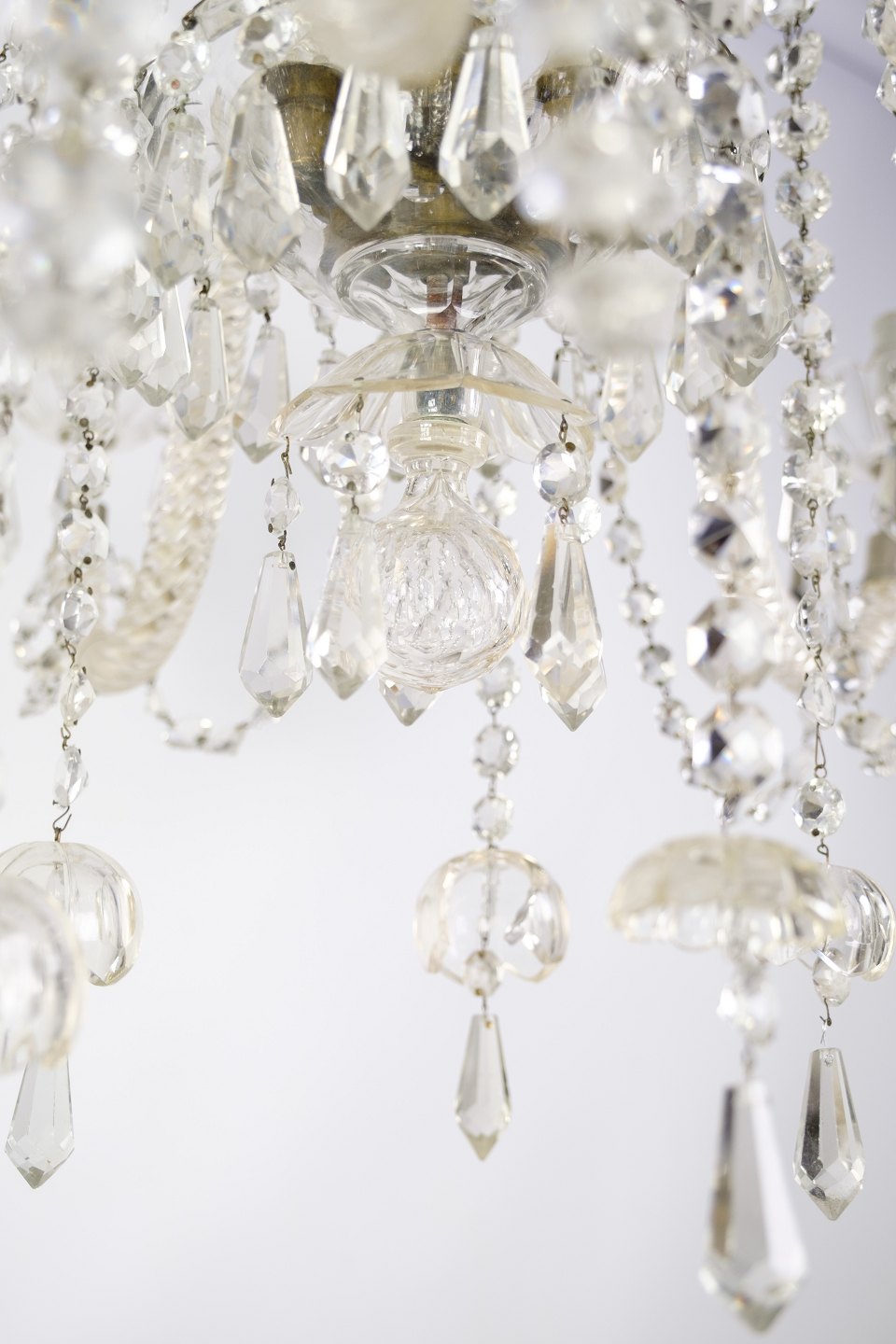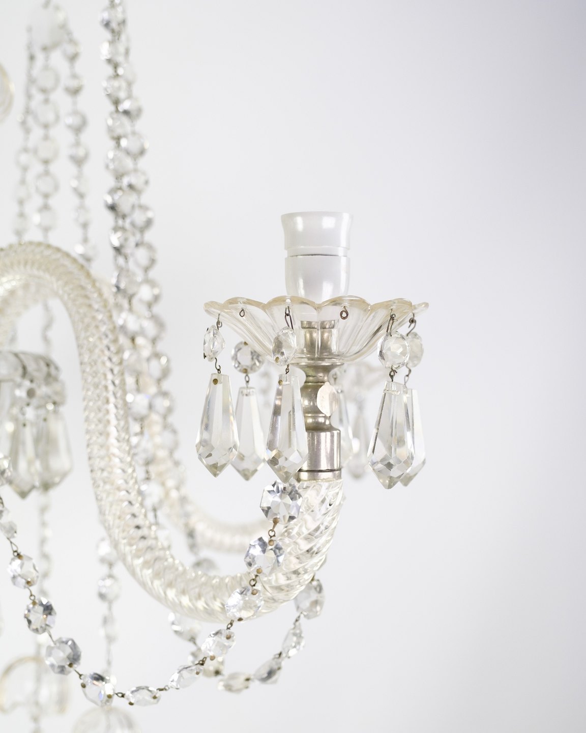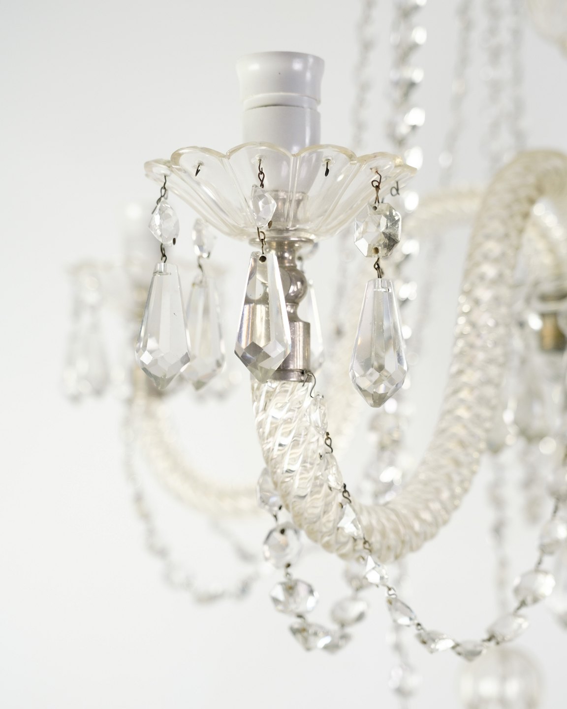 Großer Prismen-Kronleuchter mit fünf Glasarmen und elektrischem Leuchtmittel aus den 1930er Jahren. Hat viele schöne Prismen und befindet sich in sehr schönem antiken Zustand.
