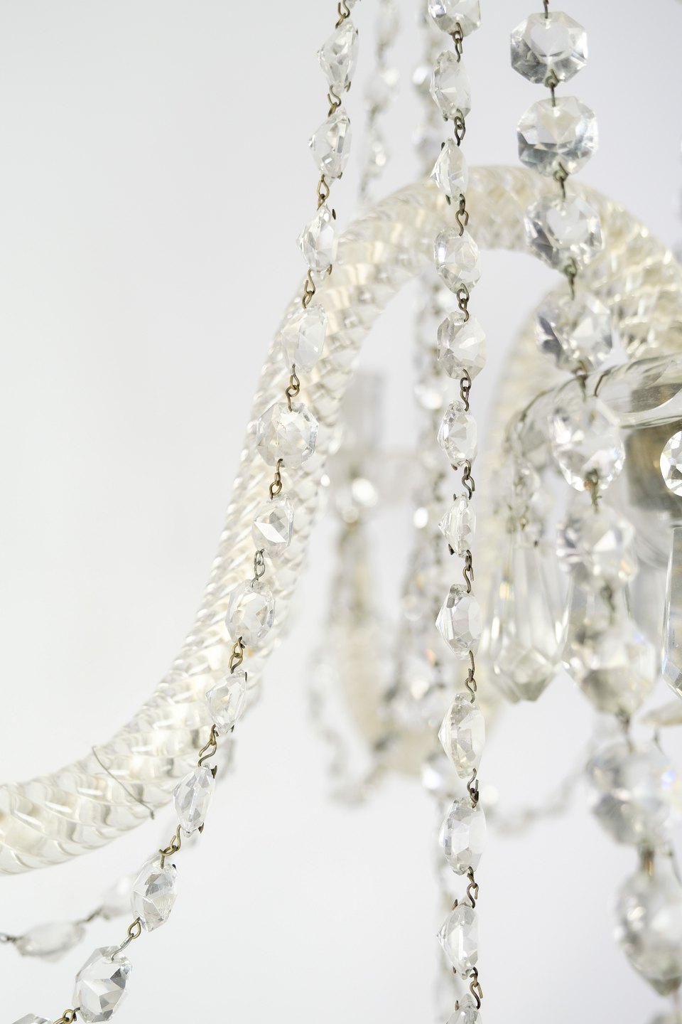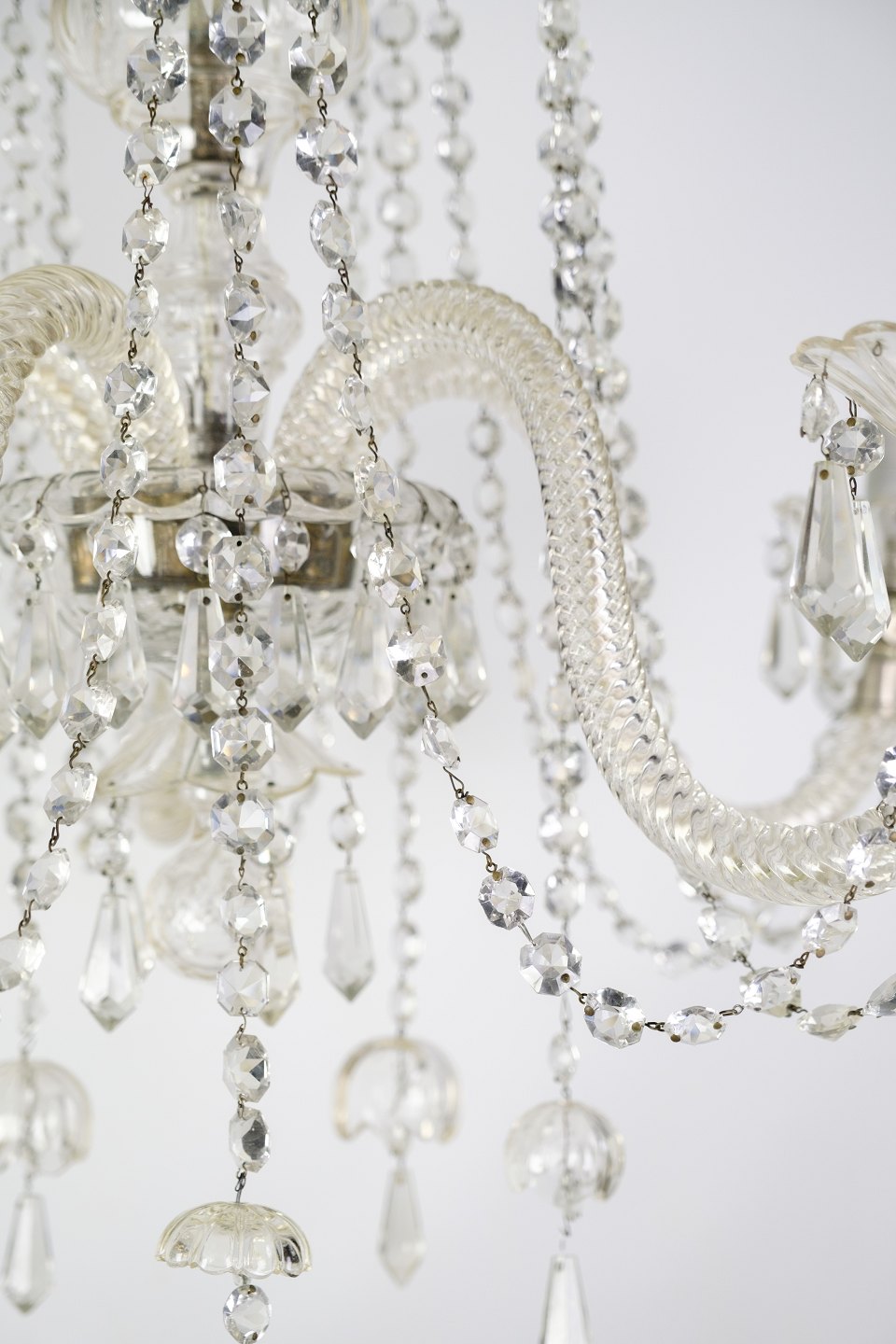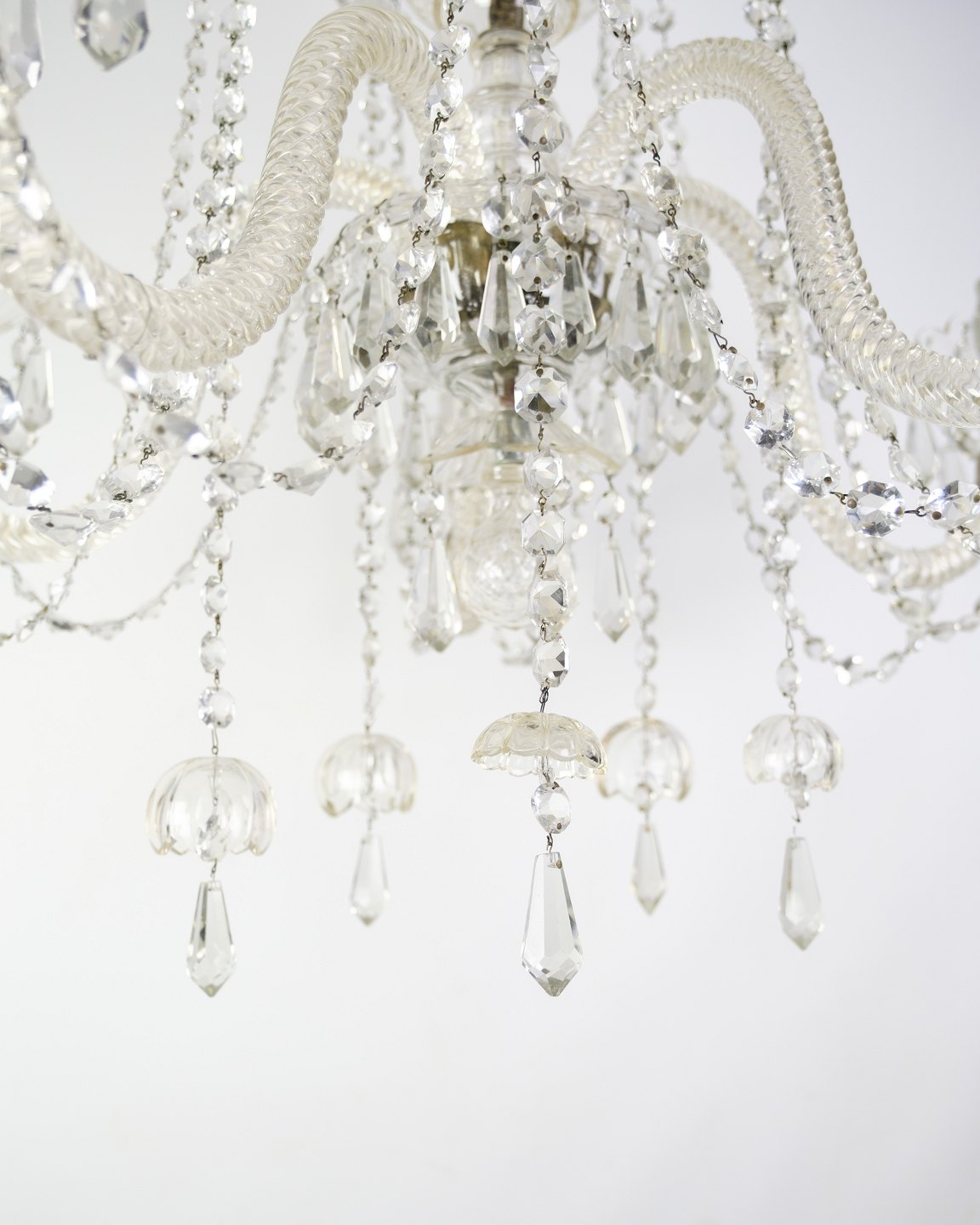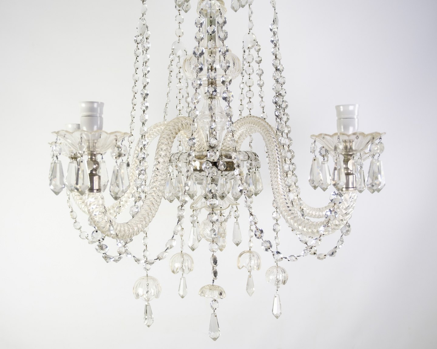 Großer Prismen-Kronleuchter mit fünf Glasarmen und elektrischem Leuchtmittel aus den 1930er Jahren. Hat viele schöne Prismen und befindet sich in sehr schönem antiken Zustand.