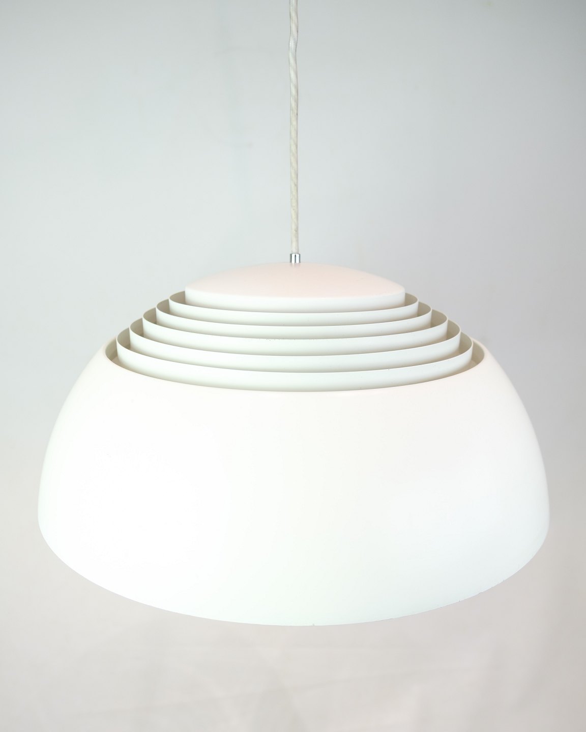 The AJ Royal pendant lamp was designed by Arne Jacobsen in 1957 as part of the overall design concept for the then SAS Royal Hotel in Copenhagen. Production was started shortly afterwards by Louis Poulsen, who continues to manufacture the lamp today. This version is in white with a white cord.