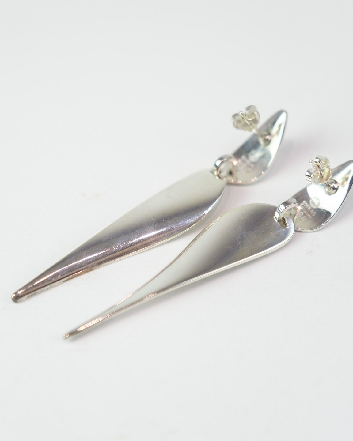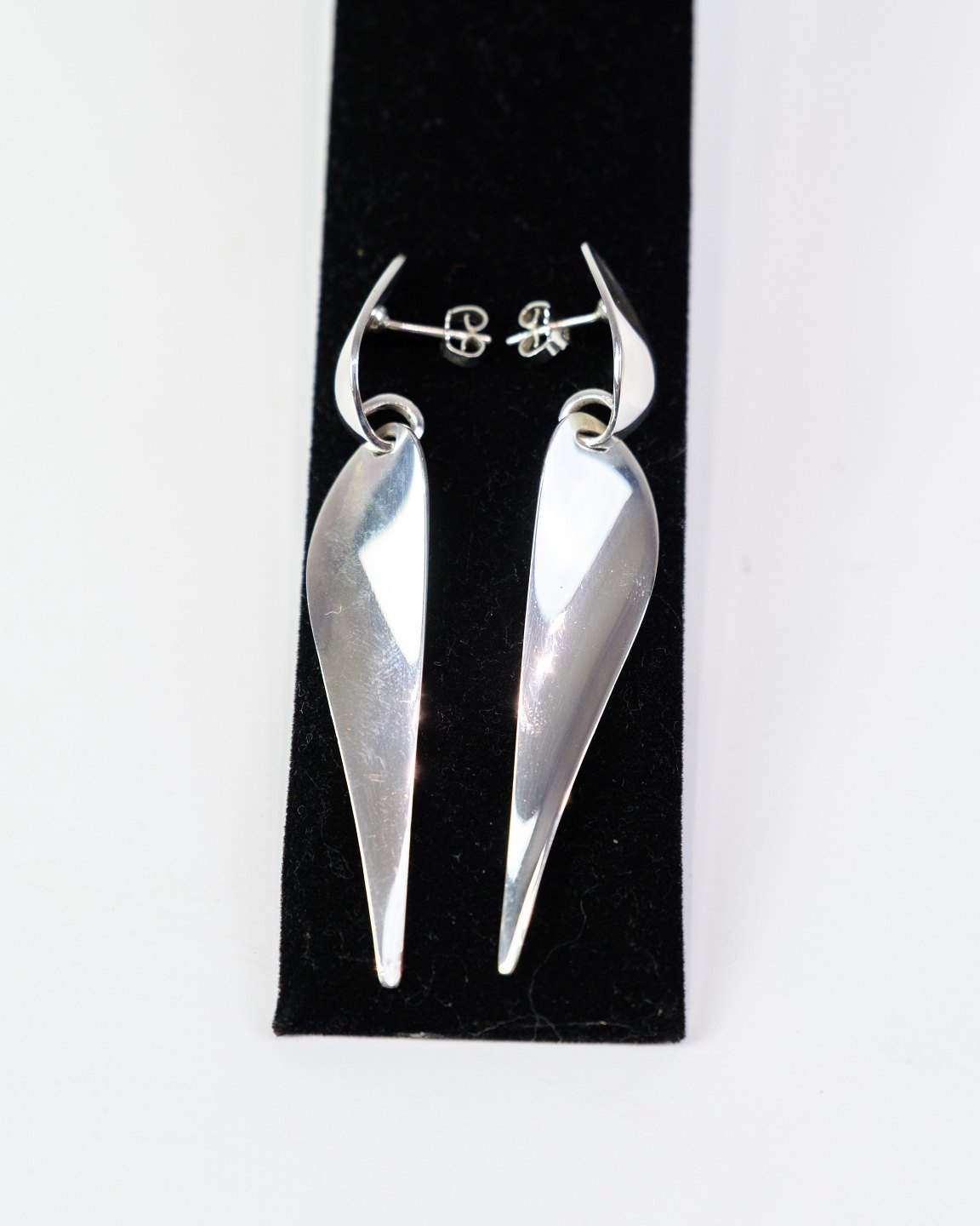 Long Drop-øreringe designet af Nanna Ditzel for Georg Jensen. Udført i sterlingsølv (925S) og kendt for deres dråbeinspirerede form, der elegant følger ansigtets bevægelse.