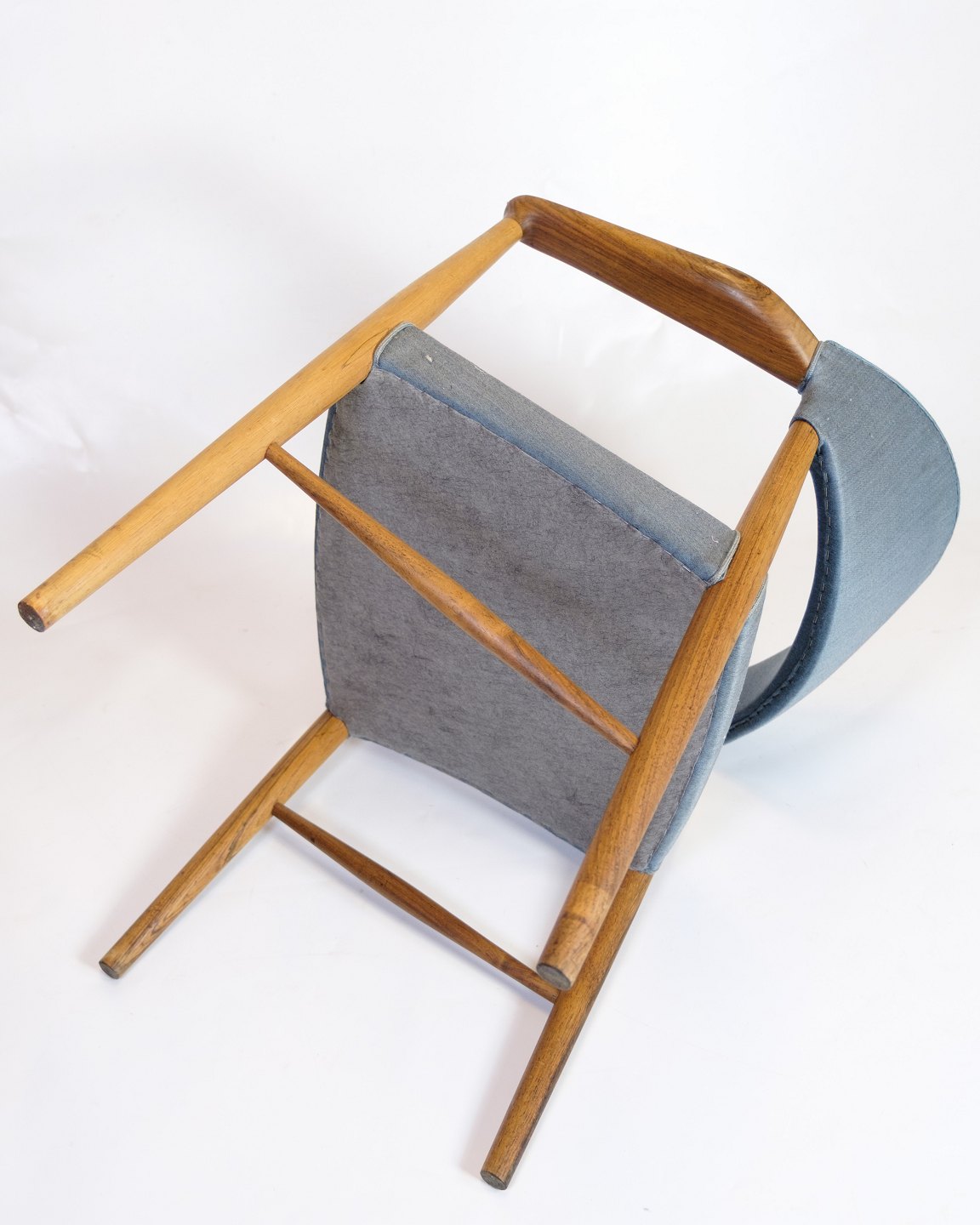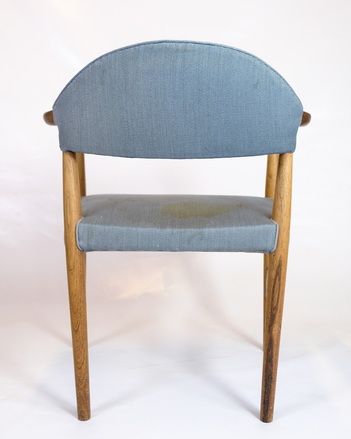 Dansk armstol i teaktræ med blåt stofsæde designet af Kurt Olsen i 1960’erne.