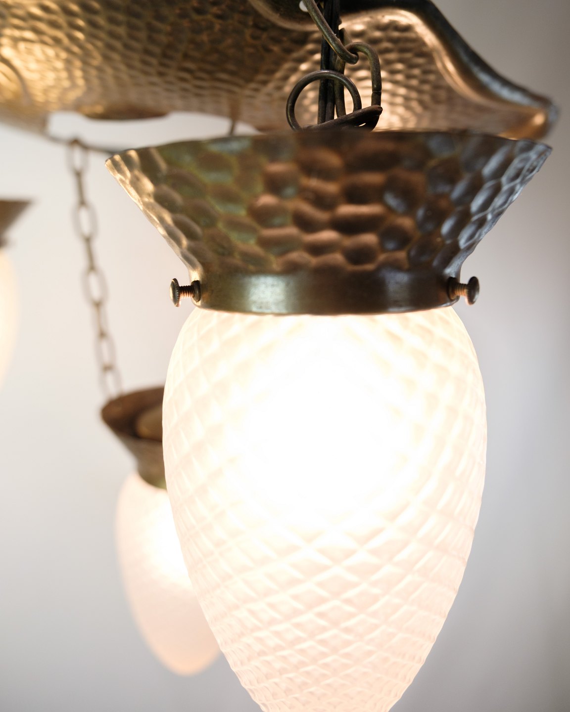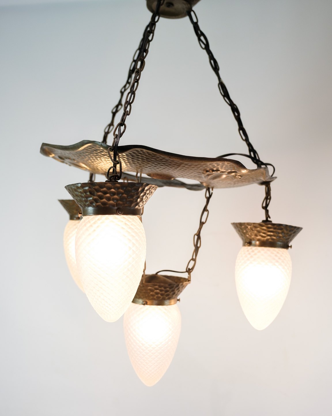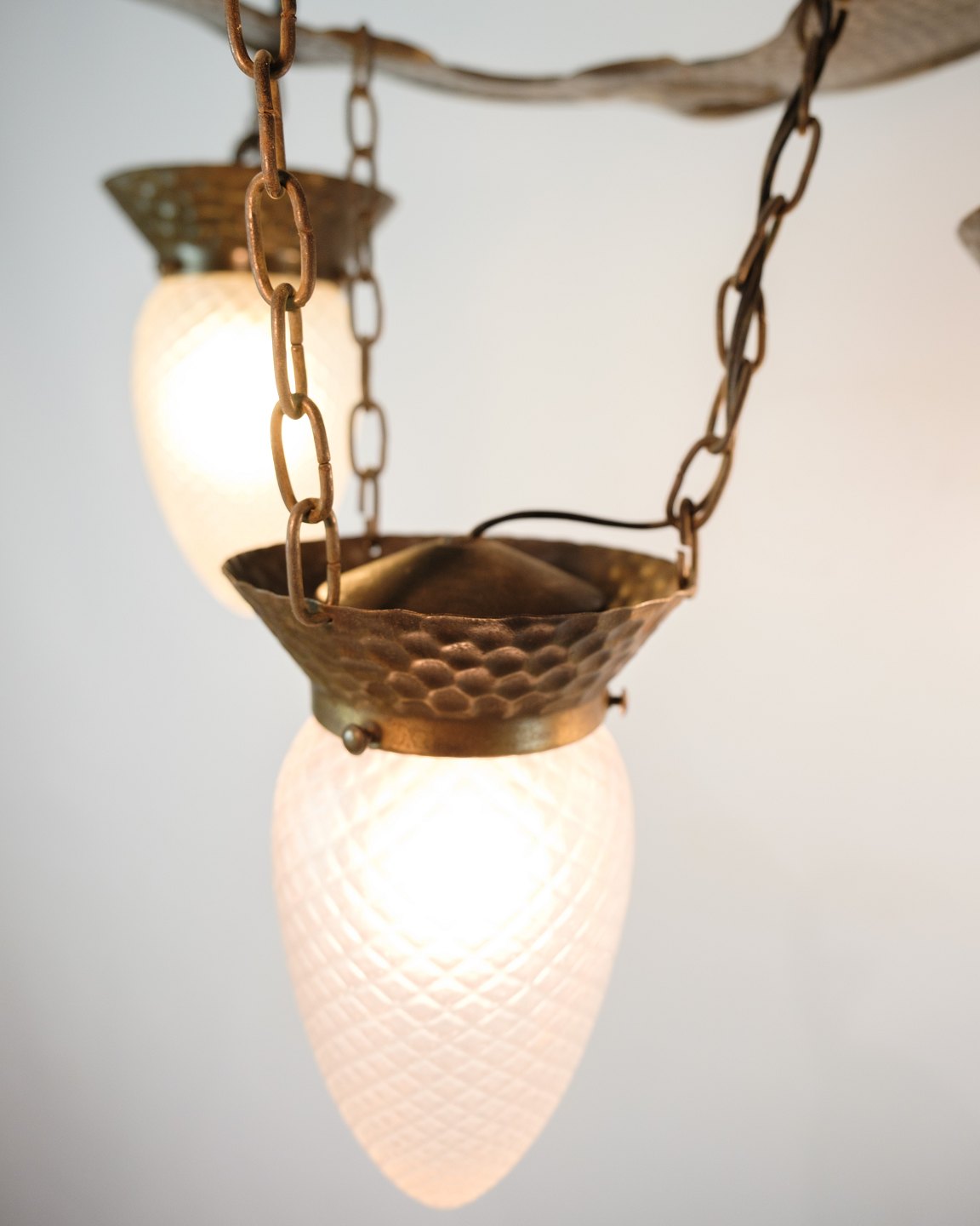 Art Nouveau chandelier from the 1920s in patinated, hammered brass with four arms and teardrop-shaped glass. Elegant classic ceiling lamp.