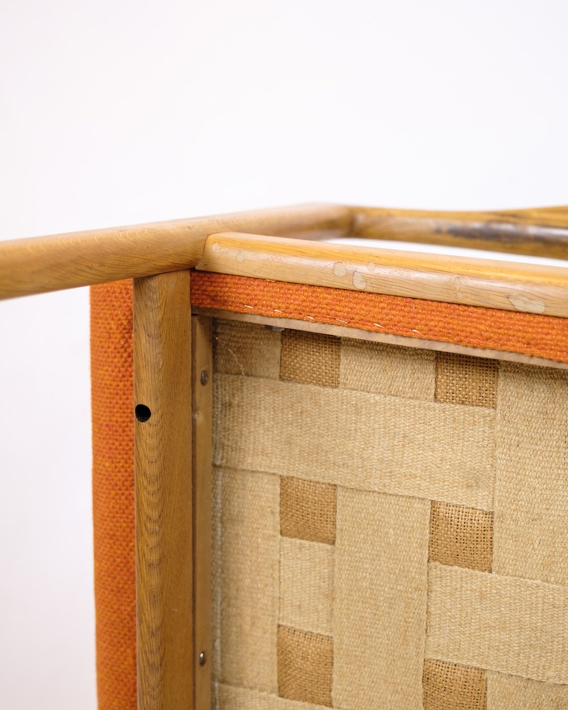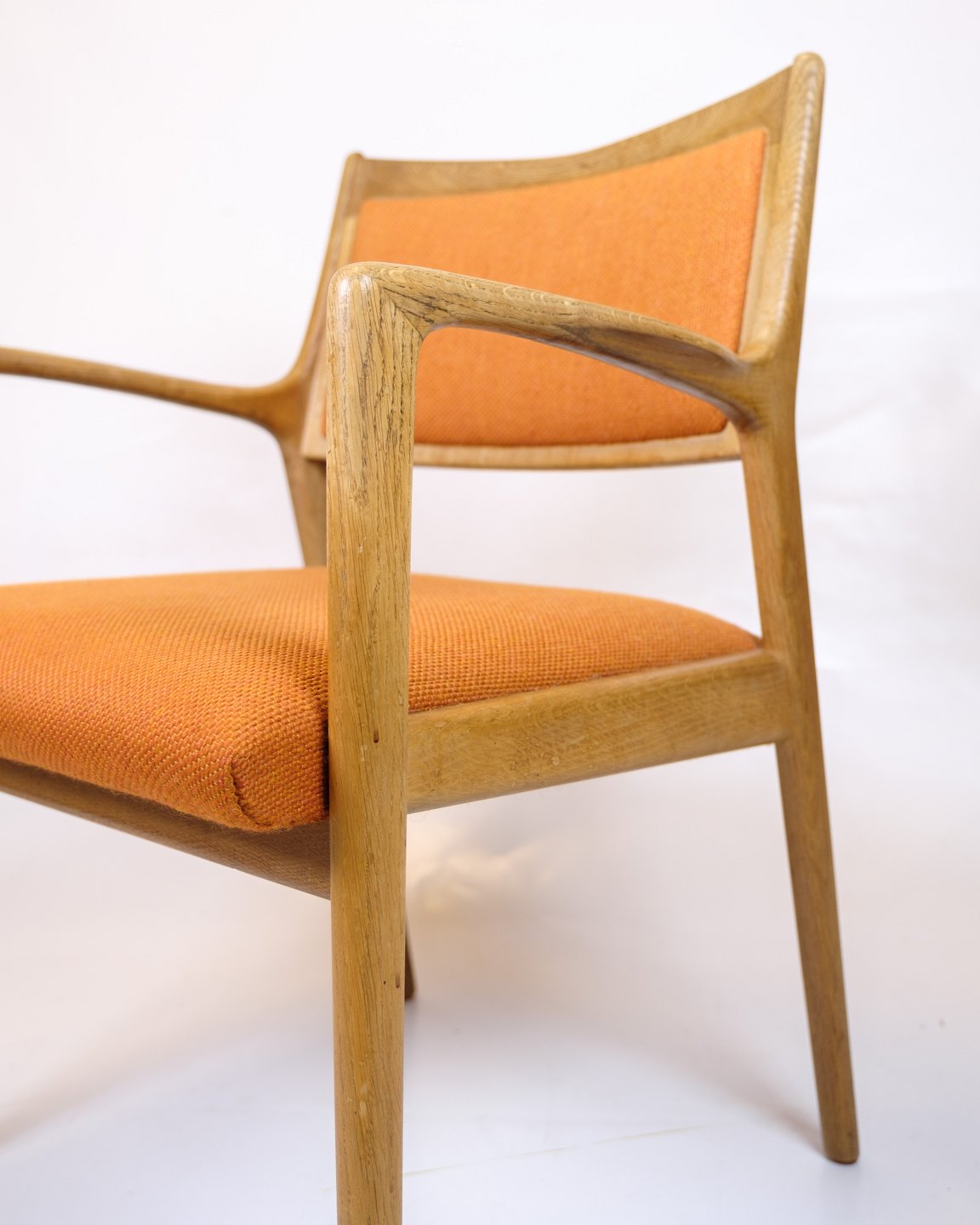 Armchair designed by Karl Erik Ekselius and produced by JOC Vetlanda in Sweden in the 1960s. The chair is made of solid oak with a light, shaped frame and fine details. The seat and back are upholstered in orange fabric.