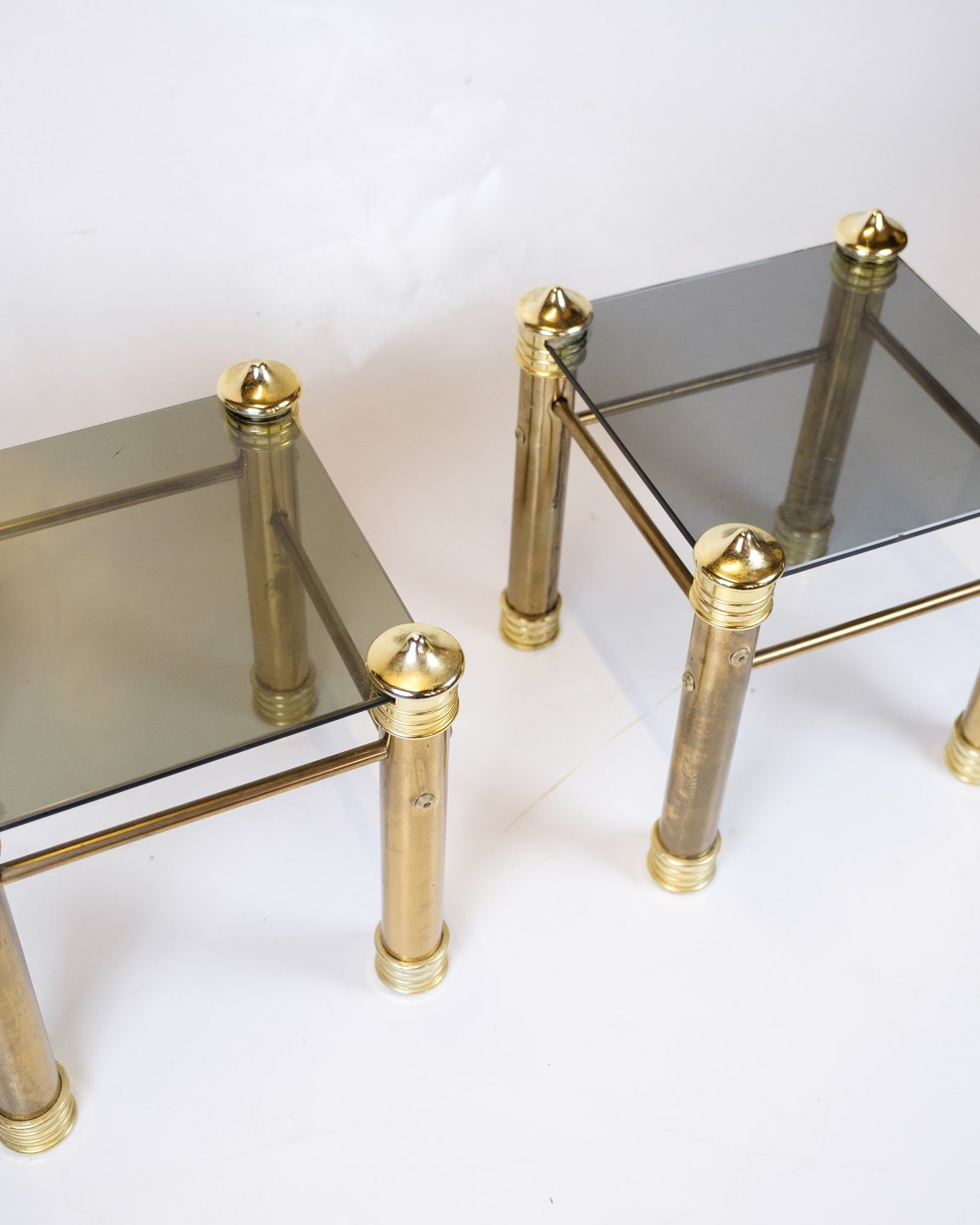Sæt af 2 vintage nat-/sideborde fra 1970’erne med messingben og sort glasplade. Elegant retrodesign i flot stand.