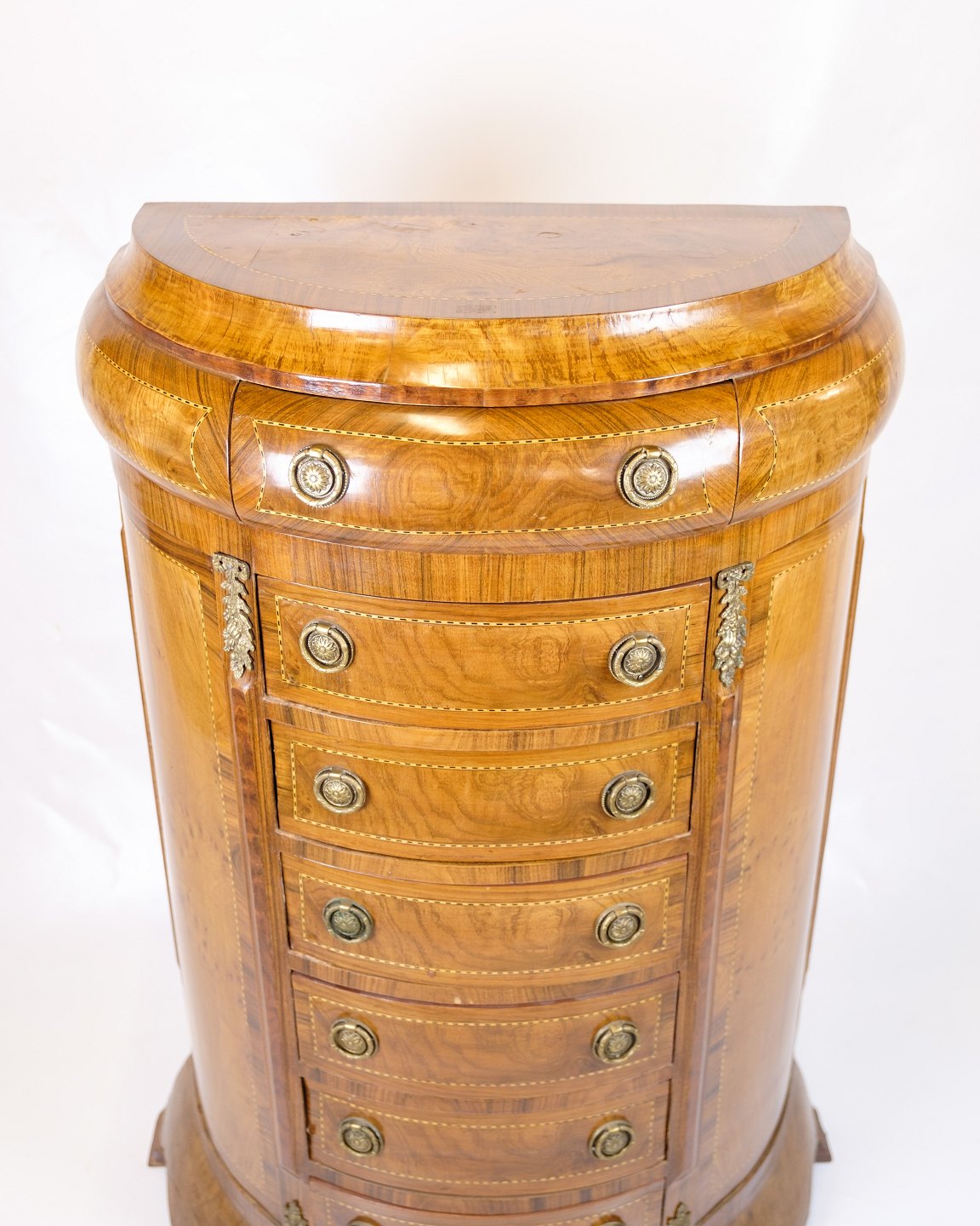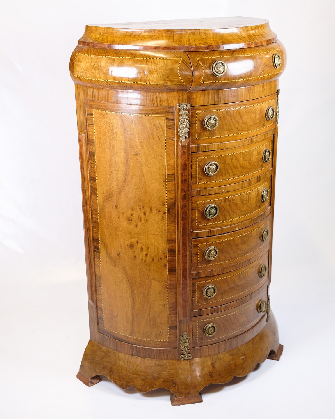 Antique high chest of drawers from the 1890s made in the Klunke style. The chest of drawers is made of rosewood with a beautiful curved front and original brass handles.