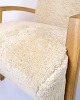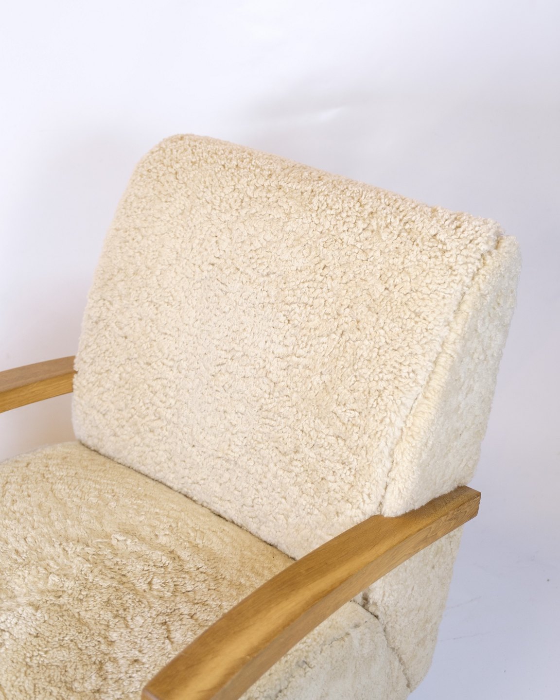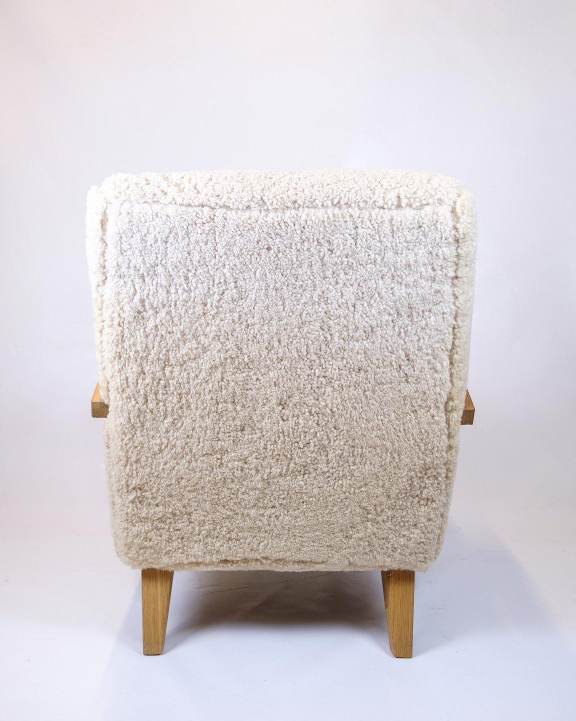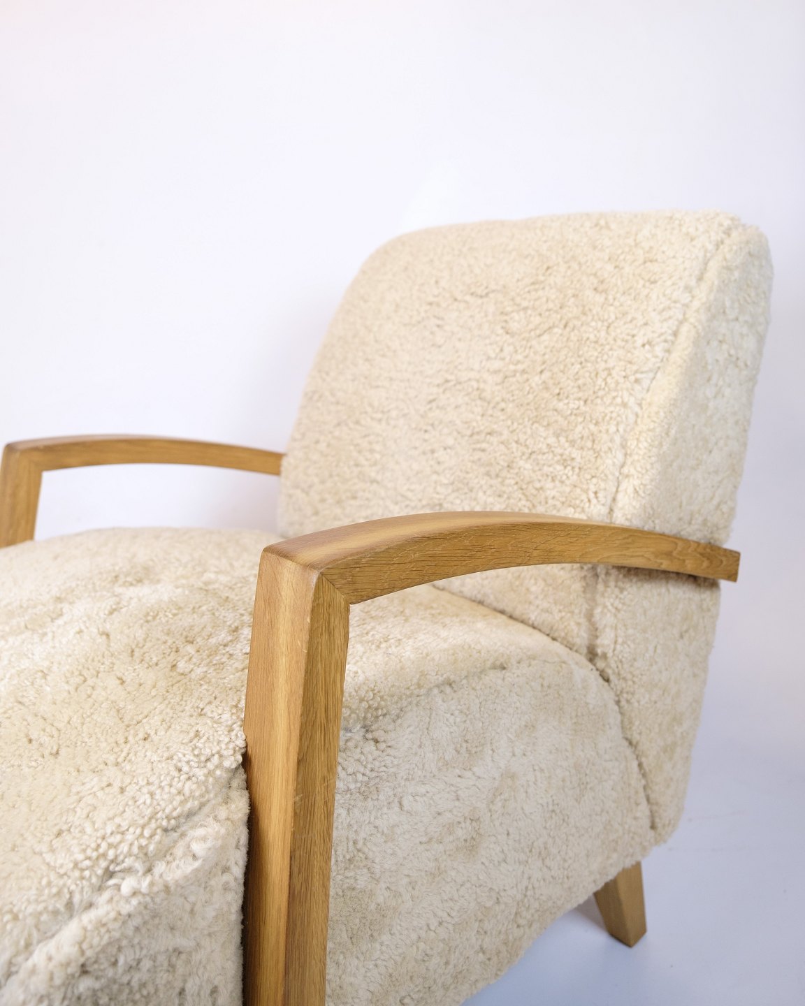 Armchair in sheep's wool and oak. Comfortable and decorative chair with timeless design and warm materials.