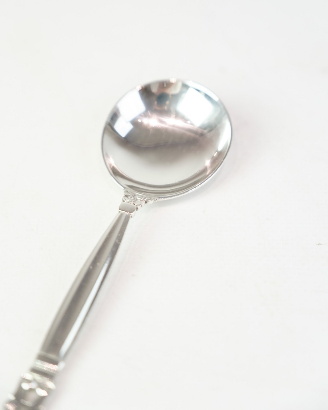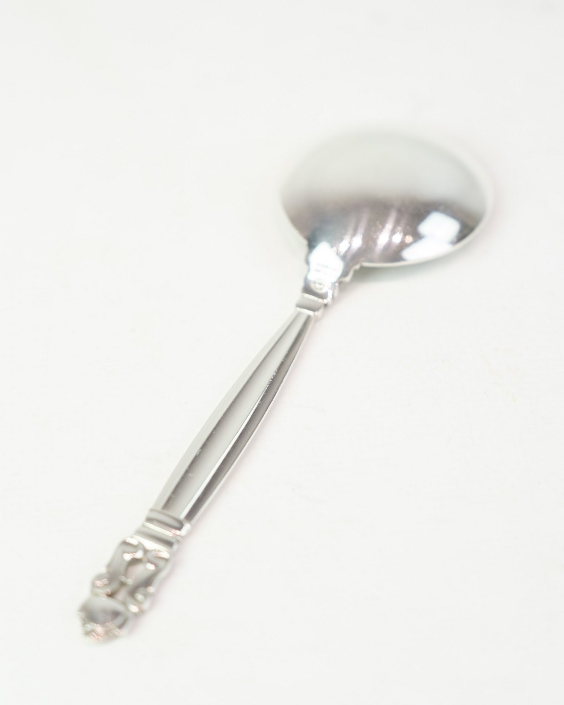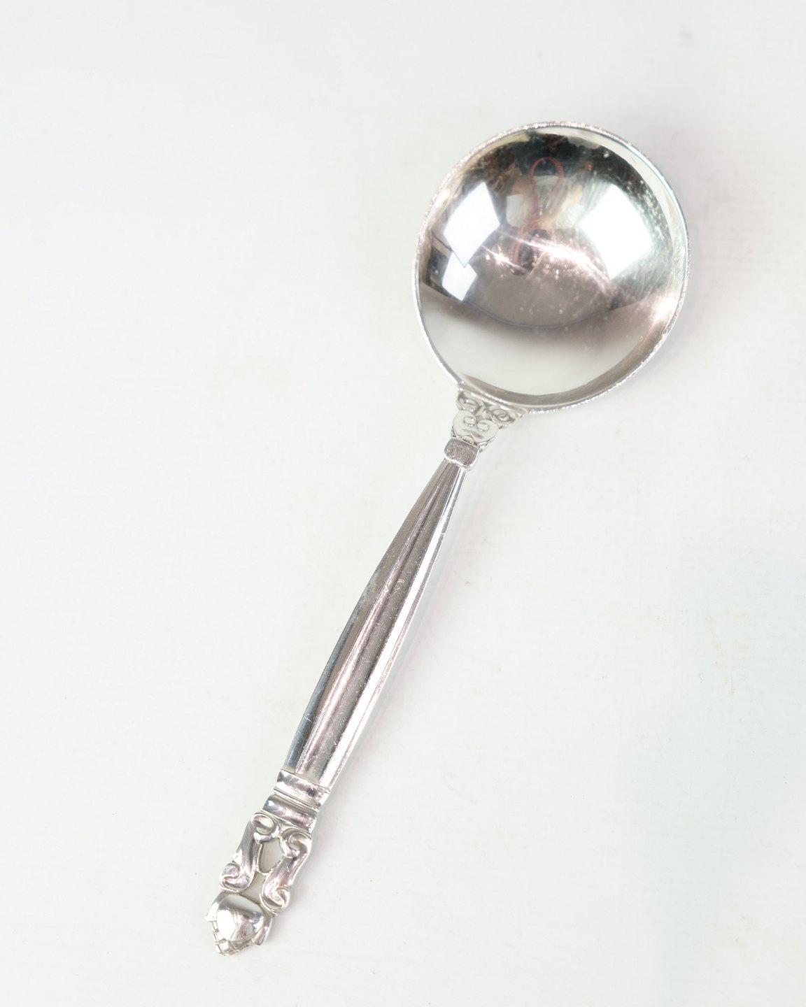 Georg Jensen small silver bouillon spoon, King pattern. Designed by Johan Rohde in 1915. Length 13 cm. Classic Danish silverwork.