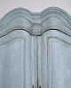 Large baroque corner cabinet from the 1780s. Original blue paint, curved doors and brass fittings. Rare and authentic antique furniture.