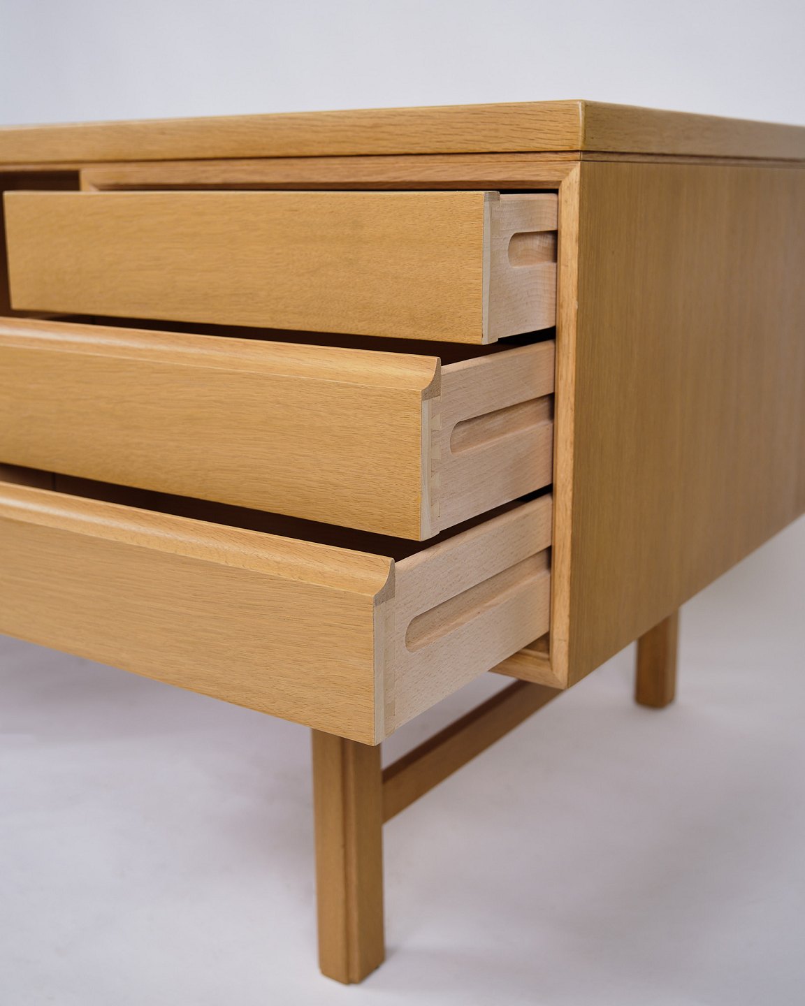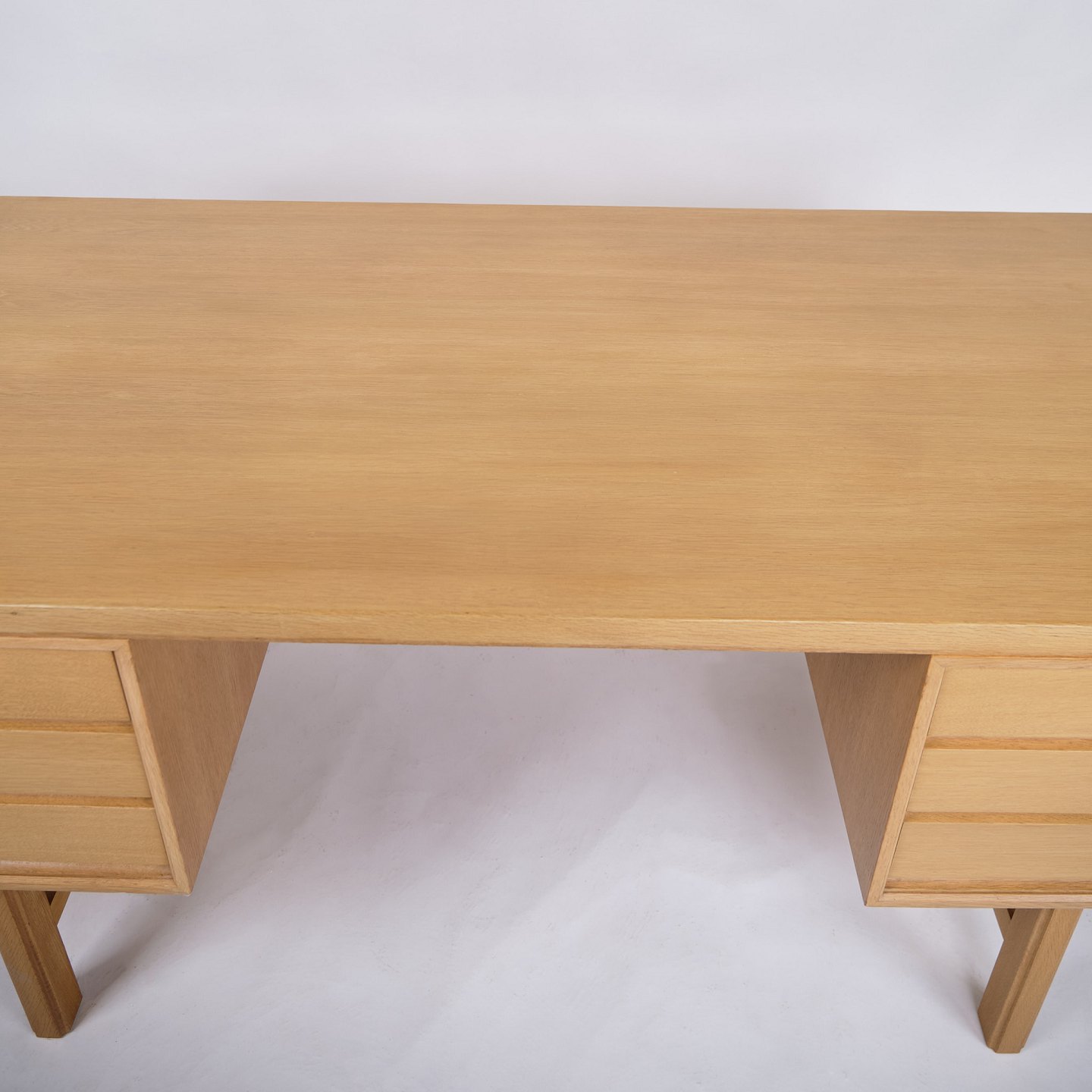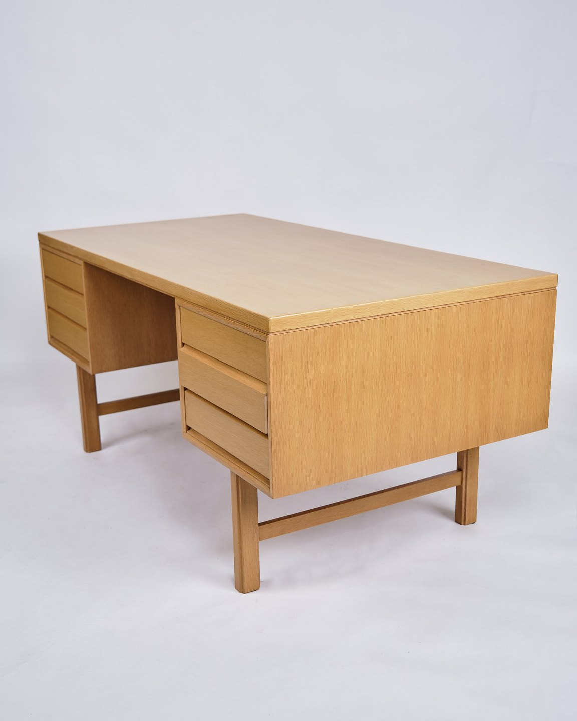 Freestanding oak desk by Omann Junior. Six drawers and classic Danish design from the 1960s.