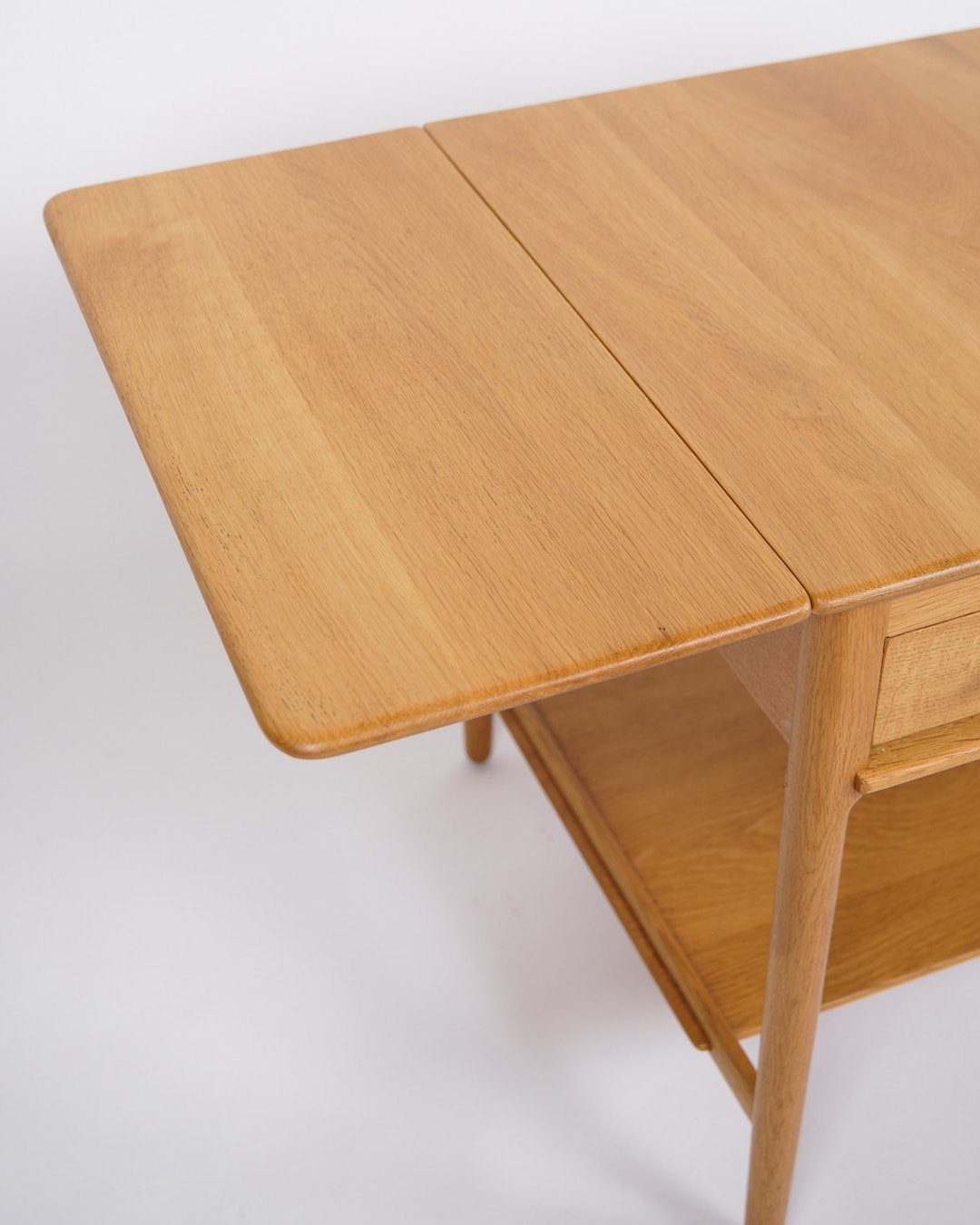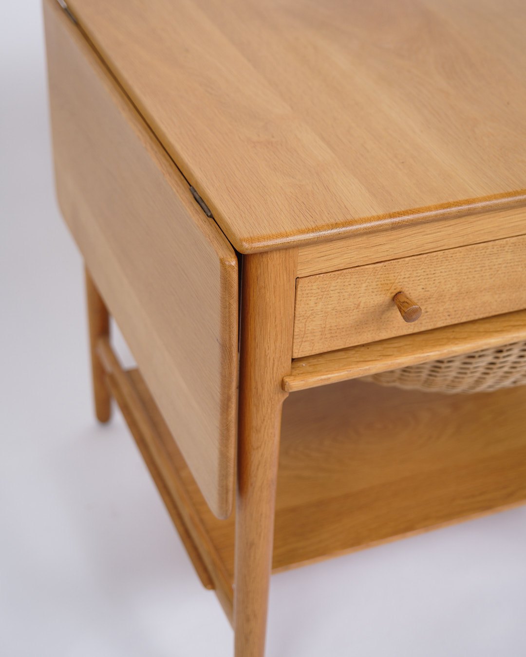 Sewing table, model AT-33, designed by Hans J. Wegner and produced by Andreas Tuck in the 1950s. The table is made of soap-treated oak and equipped with a practical shelf. The tabletop can be extended from 64.5 cm to 118.5 cm, making it both flexible and functional.