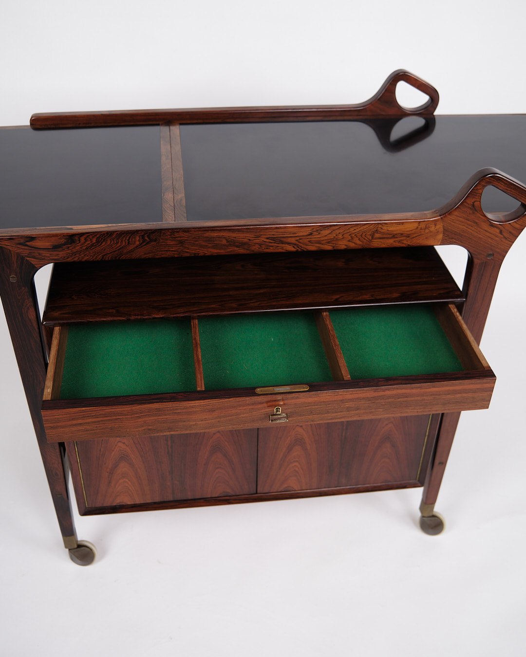 bar cabinet from Dyrlund, made of rosewood with black formica and handles in solid rosewood. The cabinet is mounted on wheels for easy mobility and has a foldable top that can expand the width from 86 cm to 142 cm. The combination of exclusive materials and functional design makes this bar cabinet a classic example of Danish furniture craftsmanship from the 1960s.