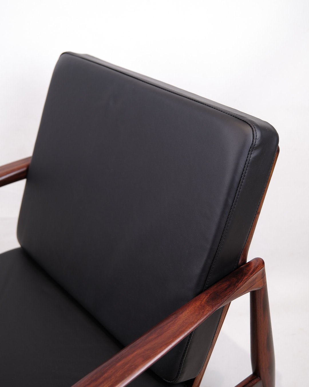 SolgtKai Kristiansen “Papirknivstolen”, model 121. Palisander og sort læder. Produceret af Magnus Olesen, 1950’erne.