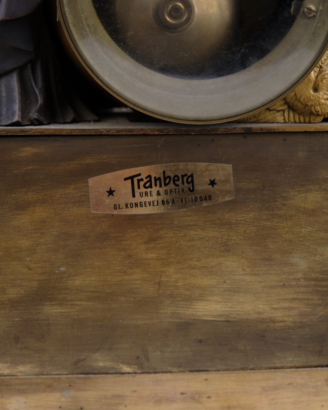 Fransk bronze kaminur fra 1820’erne. Empirestil med kvindefigur, strålekrone og bog. Elegant og velbevaret ur fra Paris.