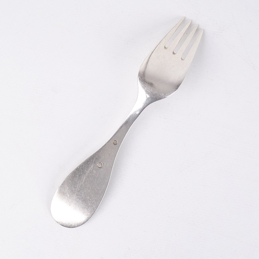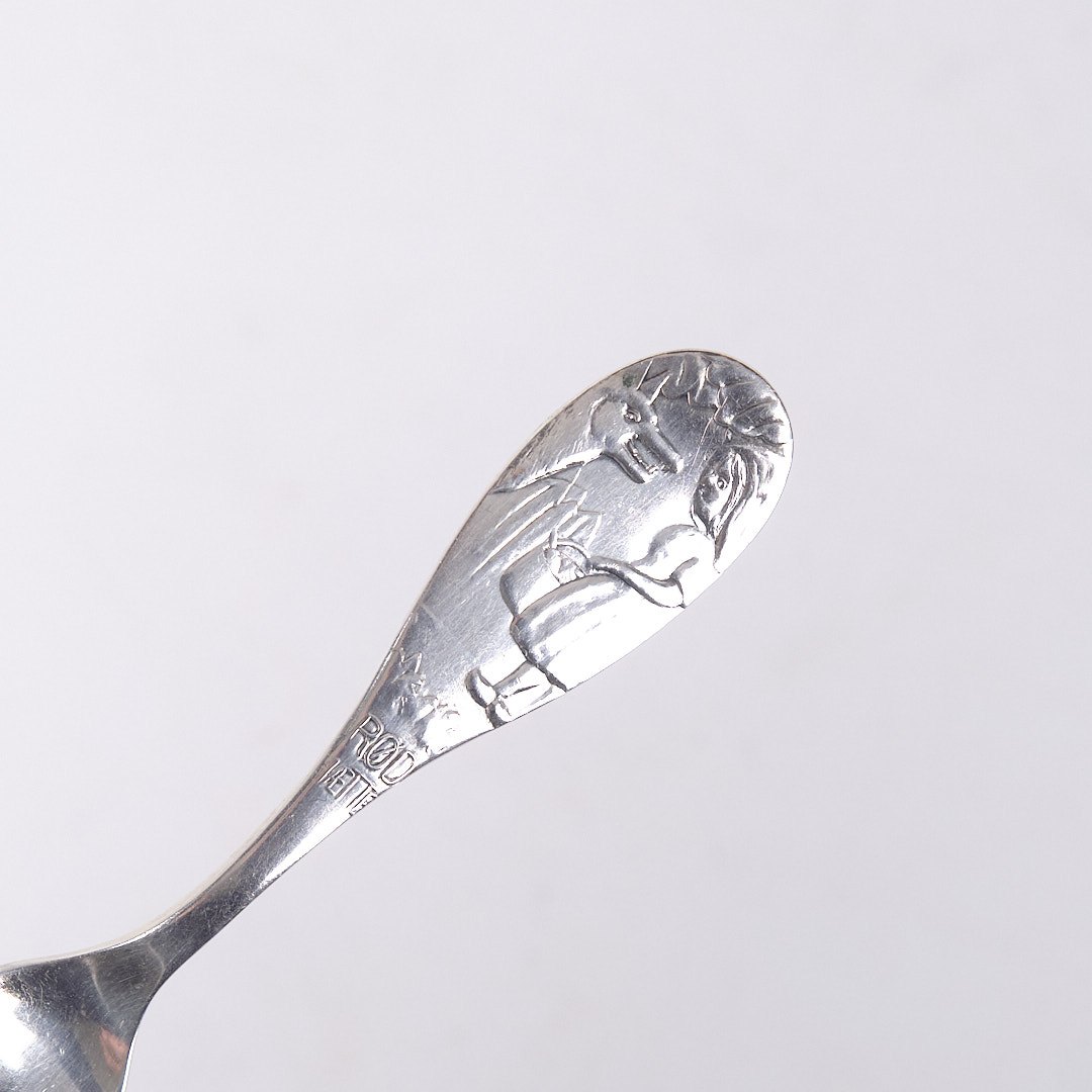 Barnegaffel i tretårnet sølv med motiv af “Den Lille Rødhætte”. Stemplet. Klassisk dansk sølvdesign.