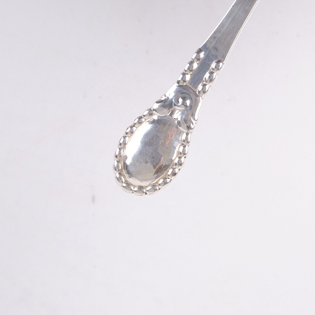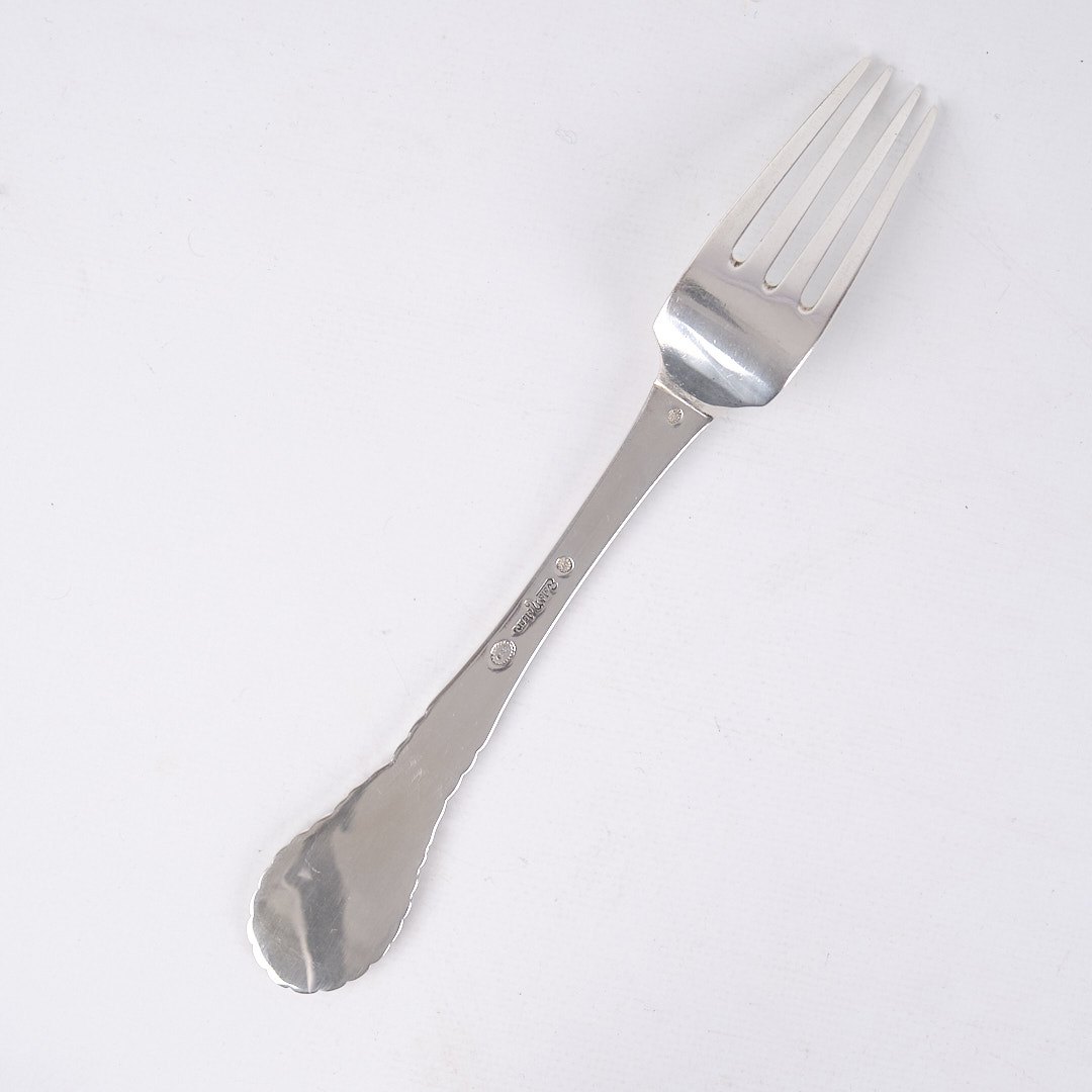 Middagsgaffel i mønster nr. 13 af Evald Nielsen. Tretårnet sølv, stemplet. Klassisk dansk sølvdesign.