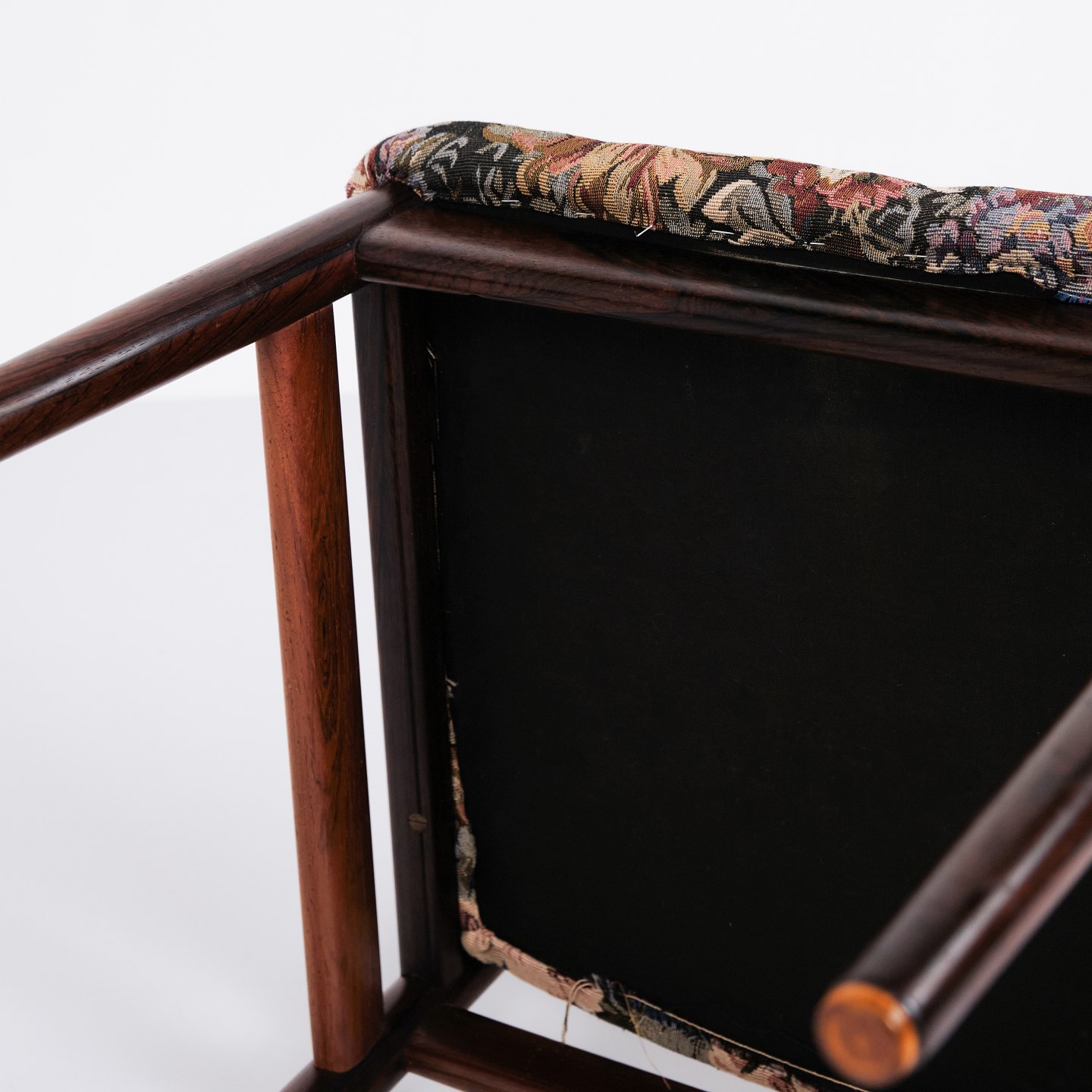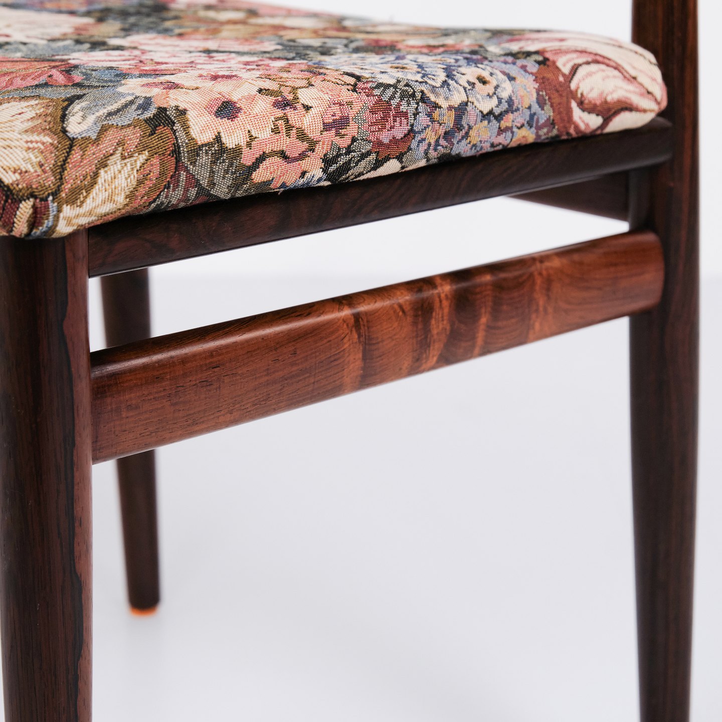 Set of six Erling Torvits dining chairs from the 1960s. Rosewood with floral seat. Sorø Møbelfabrik.