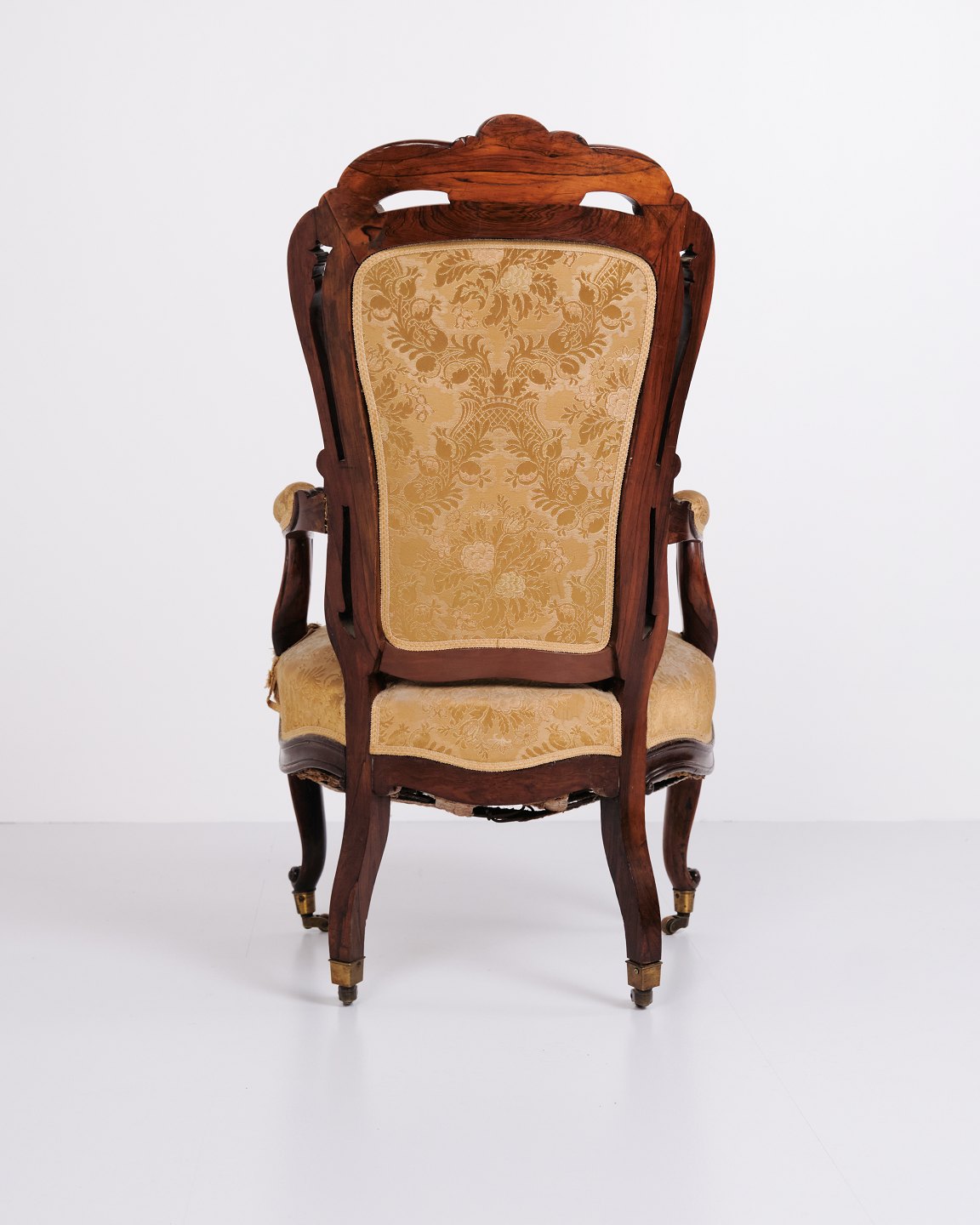 Antique armchair made of mahogany with carved details in the Rococo style, dated to around the 1890s. The seat and back are upholstered with floral upholstery.