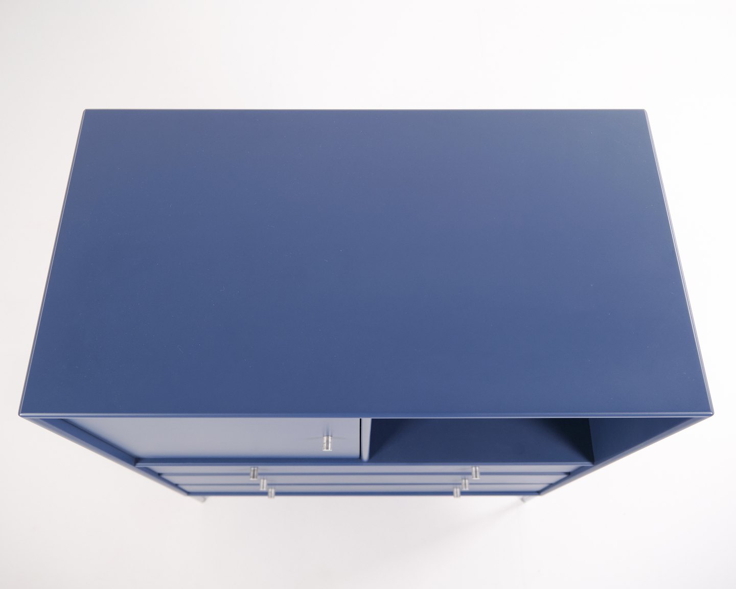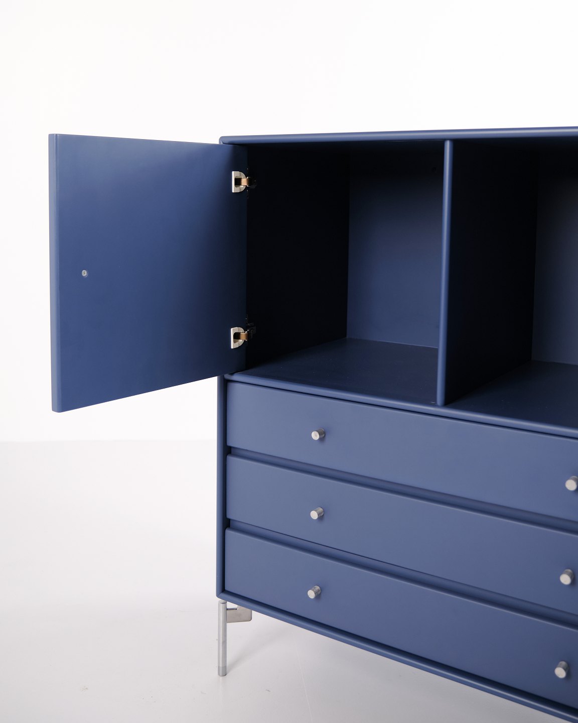 Montana chest of drawers in blue with chrome legs. Designed with three drawers and one door, offering practical and flexible storage. A classic Montana design with clean lines and high functionality.