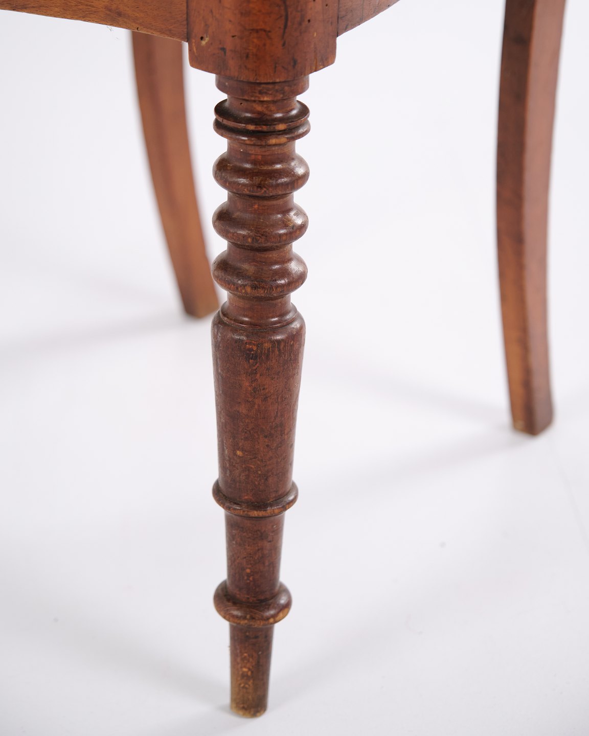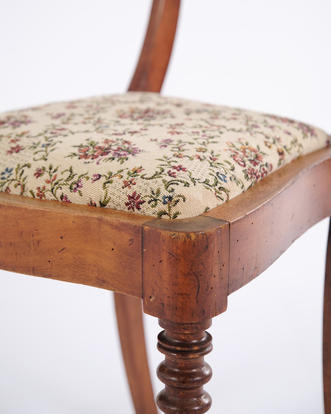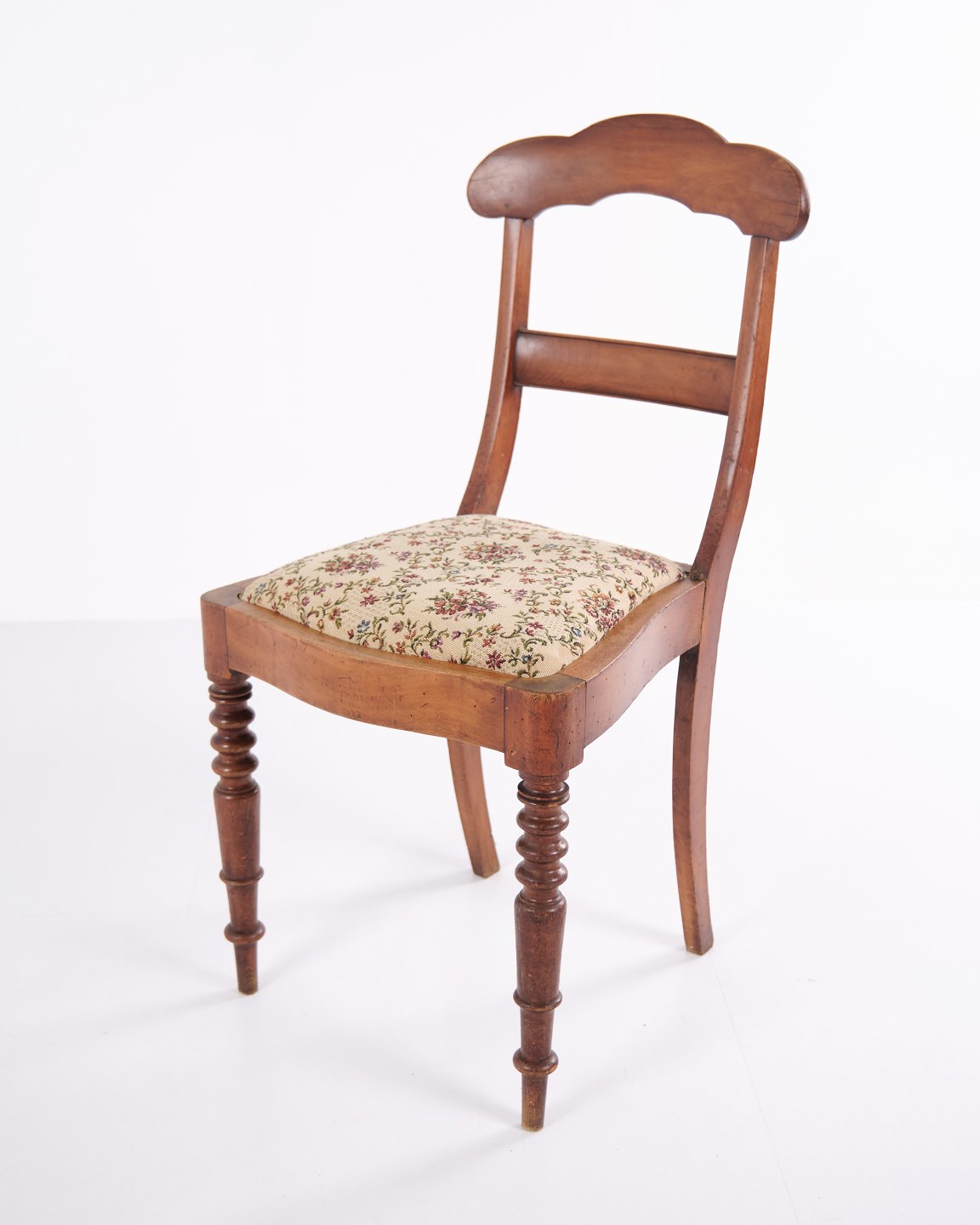 Dining or hall chair in late Empire style, crafted in mahogany and upholstered in floral fabric. Classic design with period-typical lines and a gently curved back. A decorative chair suitable for both dining spaces and hallways.
