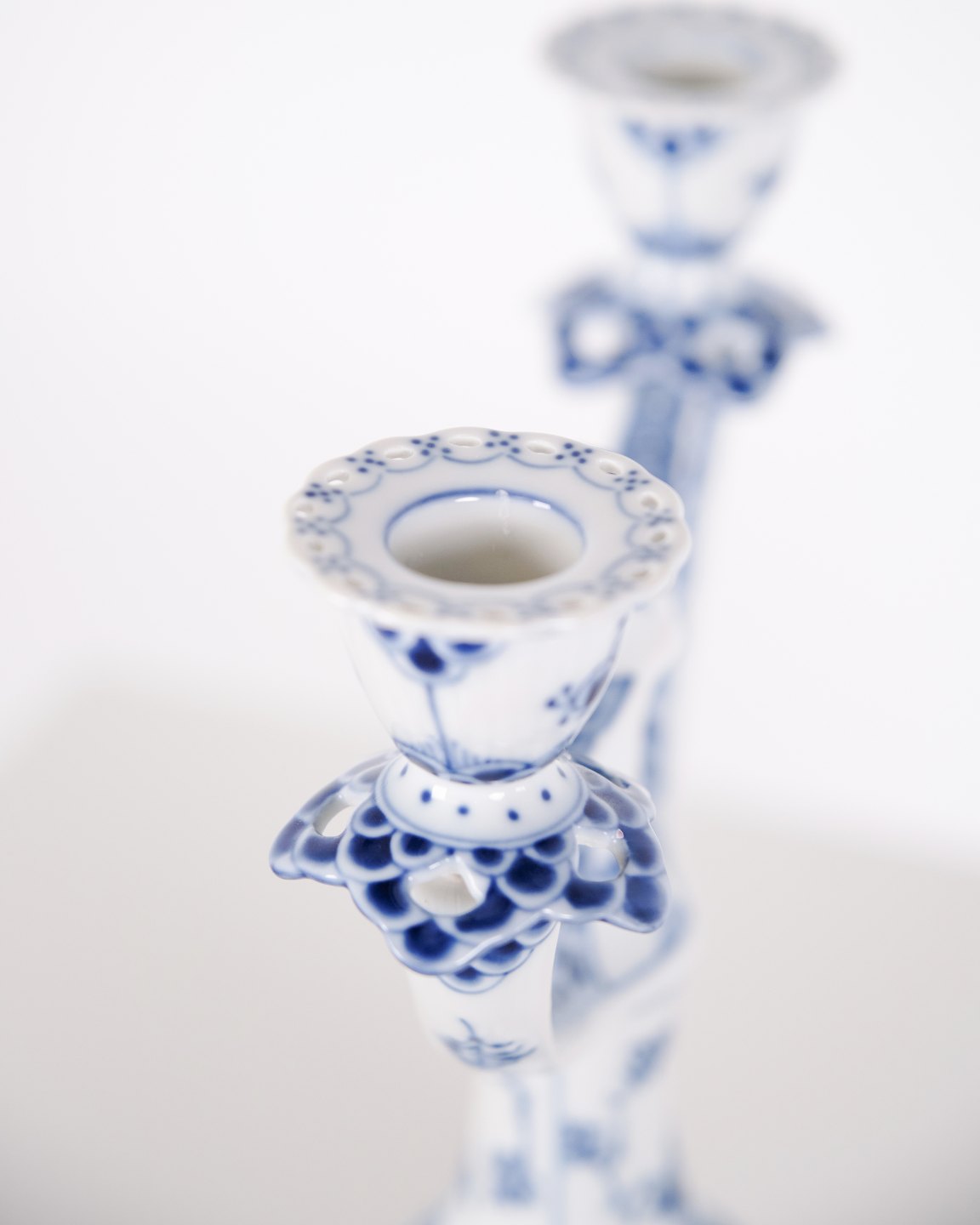 Zweiarmiger Kerzenleuchter aus Porzellan mit Musselmalet Vollspitze, Modell 1169, hergestellt von Royal Copenhagen. Handbemaltes Porzellan mit charakteristischem durchbrochenem Spitzenrand und Unterglasurdekoration. Als 1. Wahl gefertigt und Teil der klassischen Serviceproduktion von Royal Copenhagen.