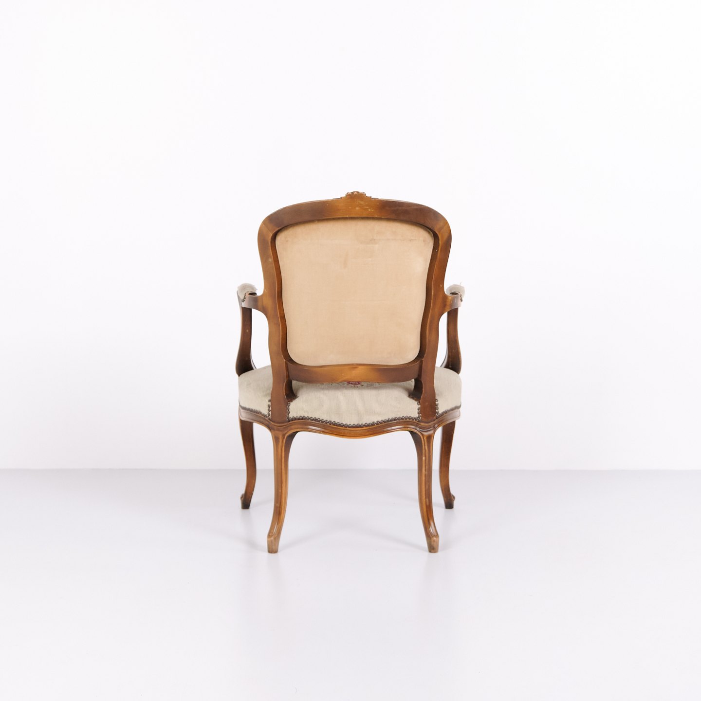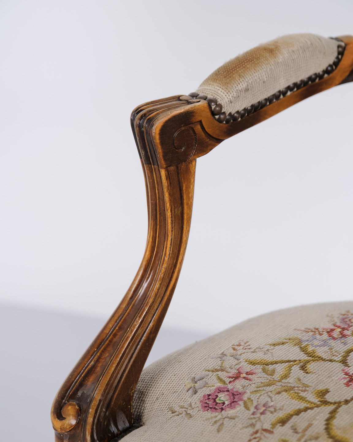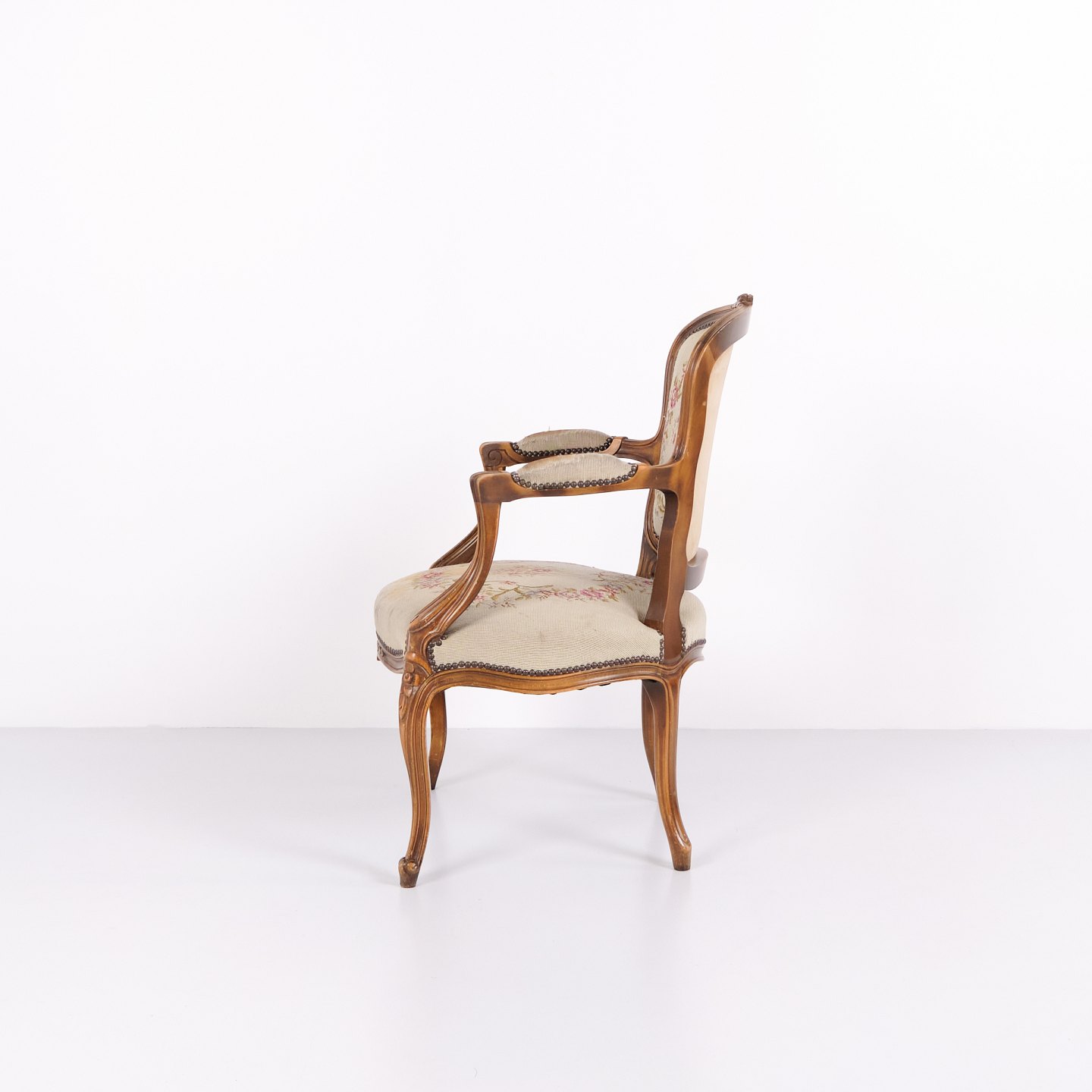 Neorokoko Sessel aus den 1930er Jahren mit geschwungenen Beinen und floralem Stoff. Klassisches und dekoratives Möbelstück mit romantischem Ausdruck.