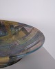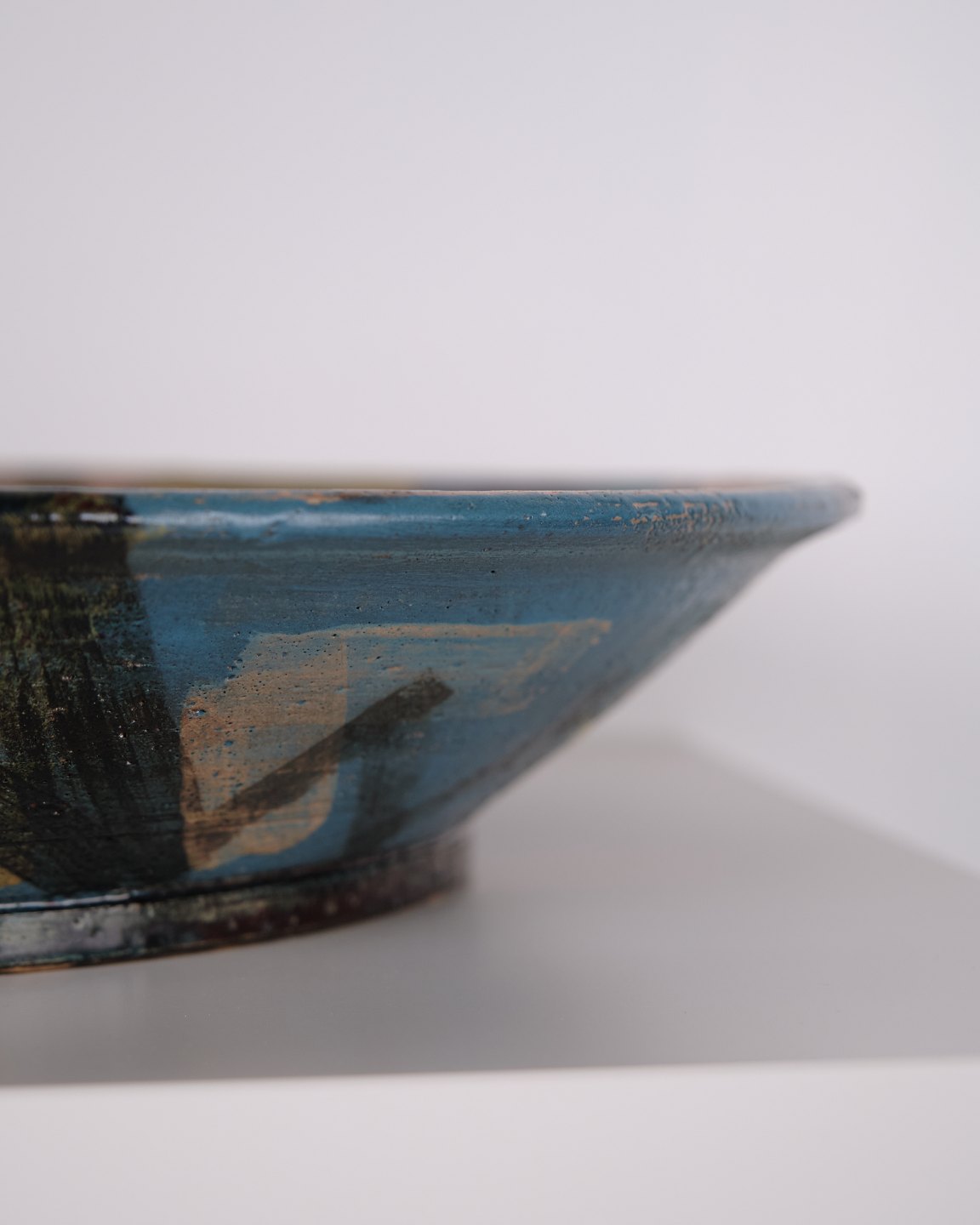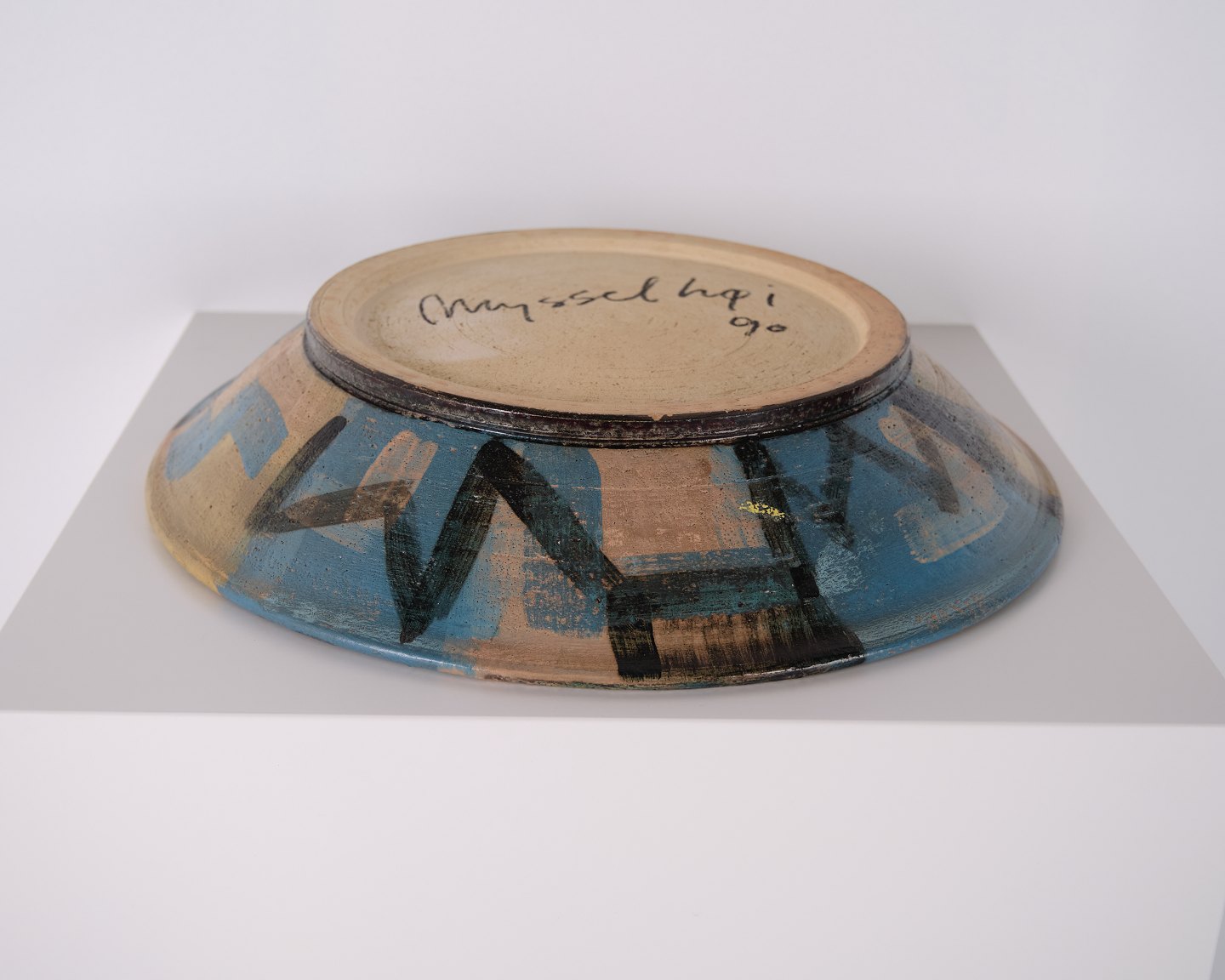 Plat en céramique unique réalisé et signé par le céramiste danois Per Weiss (né en 1953) en 1990. Le plat est décoré de couleurs vives avec un motif représentant Mysselhøj, un tumulus préhistorique situé à environ 1 km à l’ouest de Gammel Lejre près de Roskilde, où Per et Lene Weiss ont vécu auparavant. Le motif s’inspire du paysage historique de la région de Lejre et constitue une œuvre artistique unique.