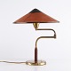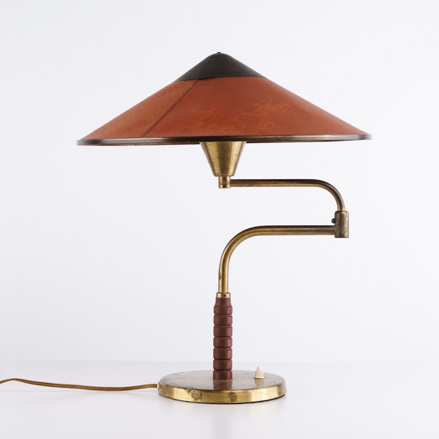 LYFA Tischlampe aus den 1930/40er Jahren aus patiniertem Messing mit Schwenkarm und originalem bernsteinfarbenem Schirm aus Schweinsleder. Klassische dänische Beleuchtung.