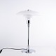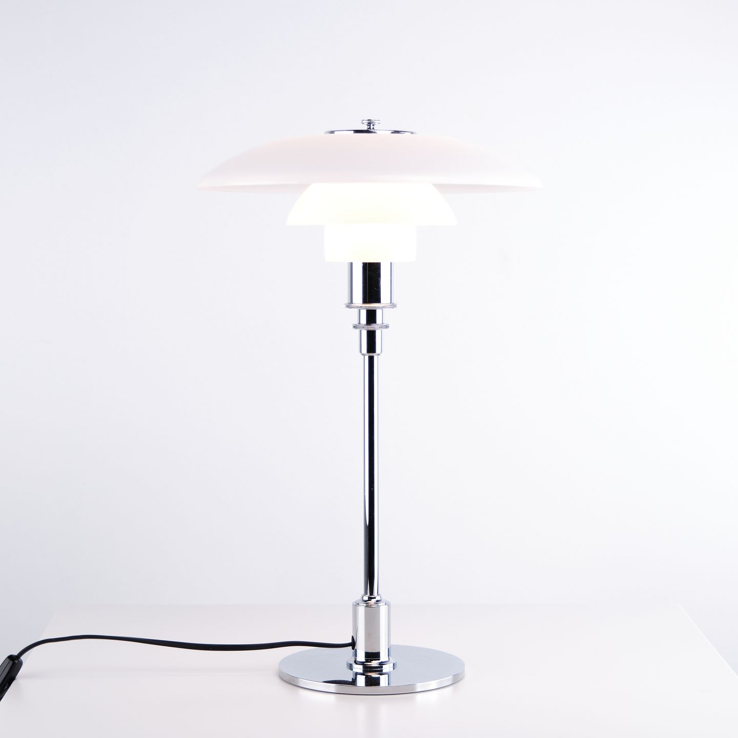 PH 3/2 Tischlampe, entworfen von Poul Henningsen und hergestellt von Louis Poulsen. Die Lampe ist mit Schirmen aus weißem Opalglas ausgeführt, die ein weiches und blendfreies Licht gewährleisten. Das ikonische Dreischirmsystem wurde für eine optimale Lichtverteilung entwickelt und ist ein zentrales Element in Henningsens Designphilosophie.