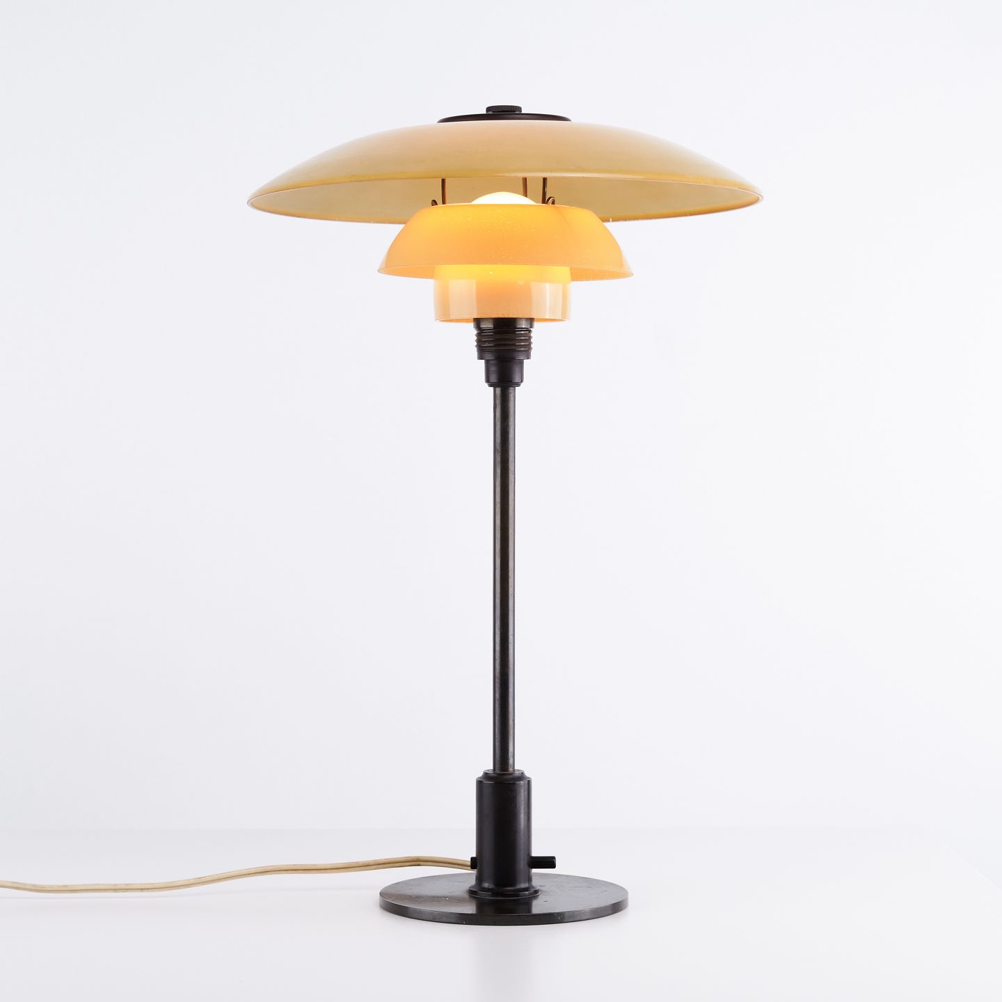 PH 3/2 Tischlampe, entworfen von Poul Henningsen und hergestellt von Louis Poulsen in den 1930er Jahren. Die Lampe ist mit einlagig gelb lackierten Schirmen ausgeführt, die ein warmes und angenehmes Licht erzeugen. Das ikonische Dreischirmsystem wurde entwickelt, um eine optimale Lichtverteilung zu gewährleisten und Blendung zu minimieren.