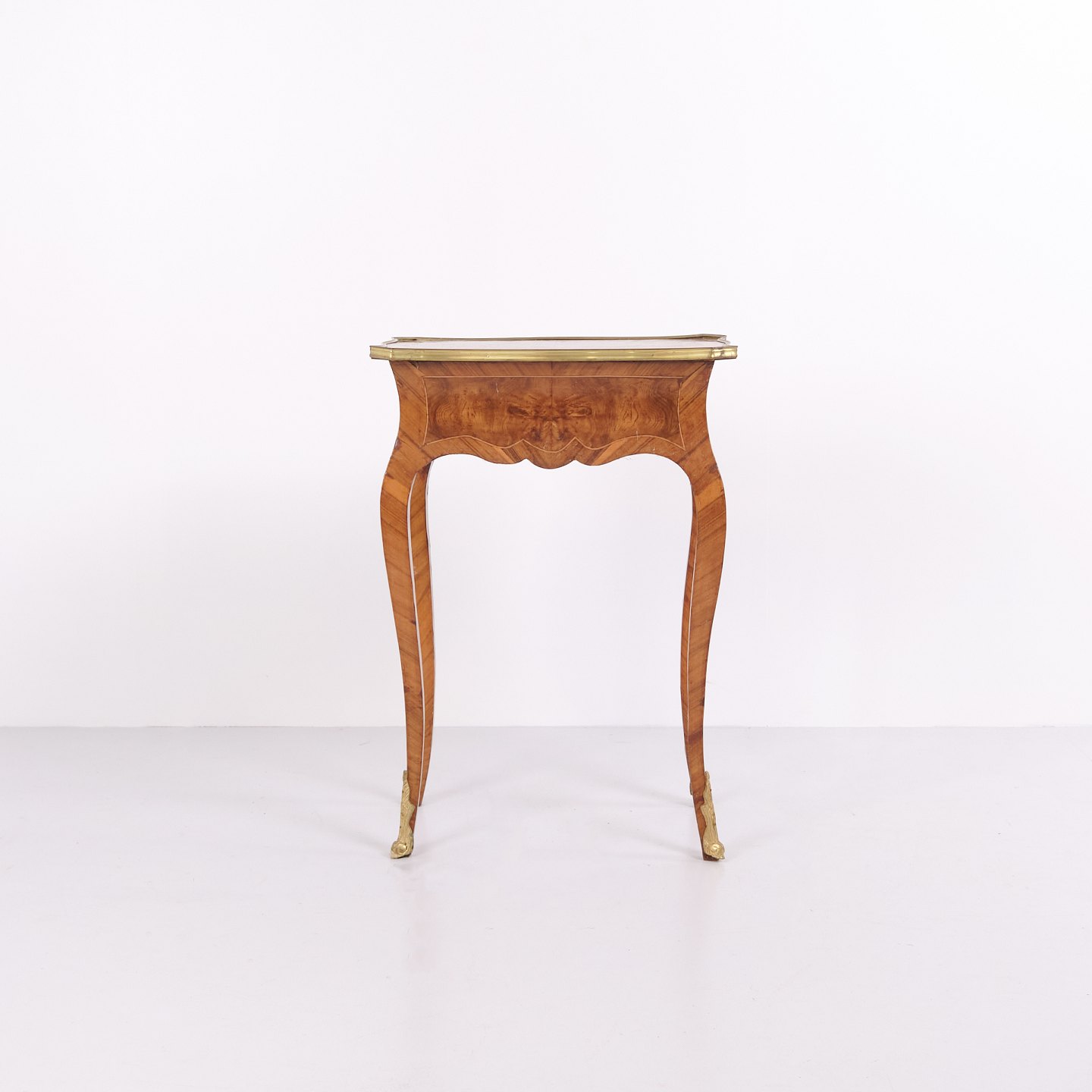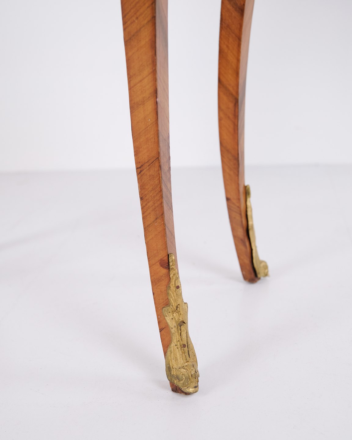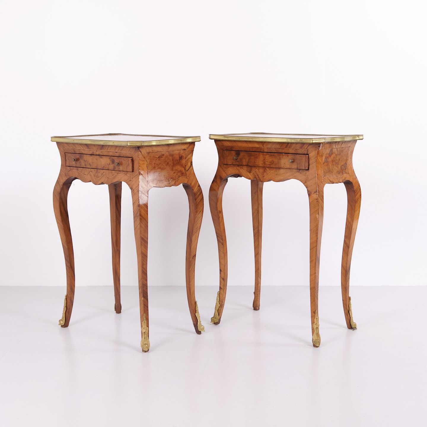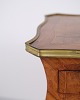 Ein Paar Beistelltische im Neo-Rokoko-Stil aus den 1890er Jahren. Gefertigt aus Rosenholz mit feinen Intarsien, geschwungenen Beinen sowie Details aus Bronze und Messingkante. Die reich verzierte Formensprache und die geschwungenen Linien spiegeln den historischen Stil mit Fokus auf Handwerk und Ornamentik wider.