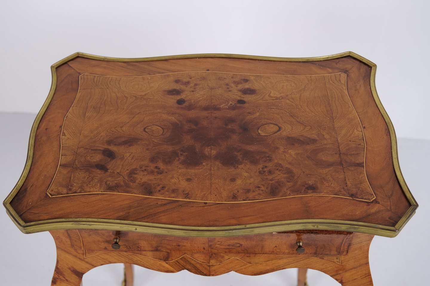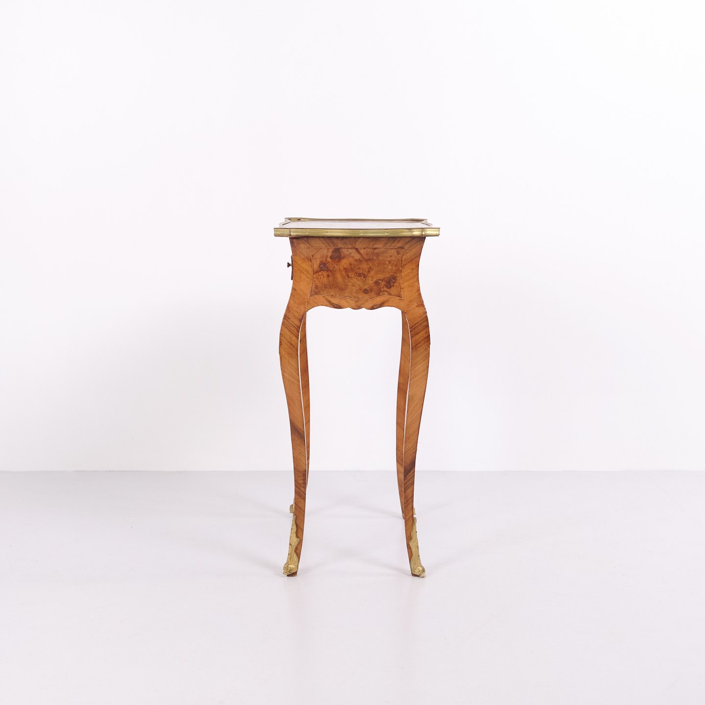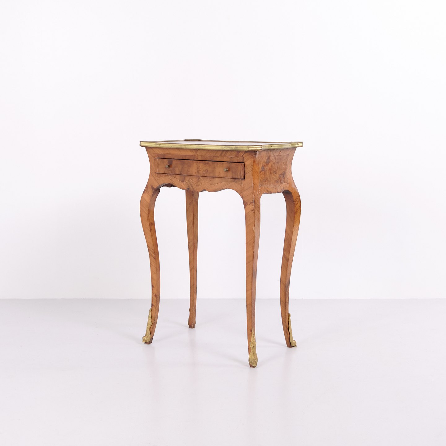 Ein Paar Beistelltische im Neo-Rokoko-Stil aus den 1890er Jahren. Gefertigt aus Rosenholz mit feinen Intarsien, geschwungenen Beinen sowie Details aus Bronze und Messingkante. Die reich verzierte Formensprache und die geschwungenen Linien spiegeln den historischen Stil mit Fokus auf Handwerk und Ornamentik wider.