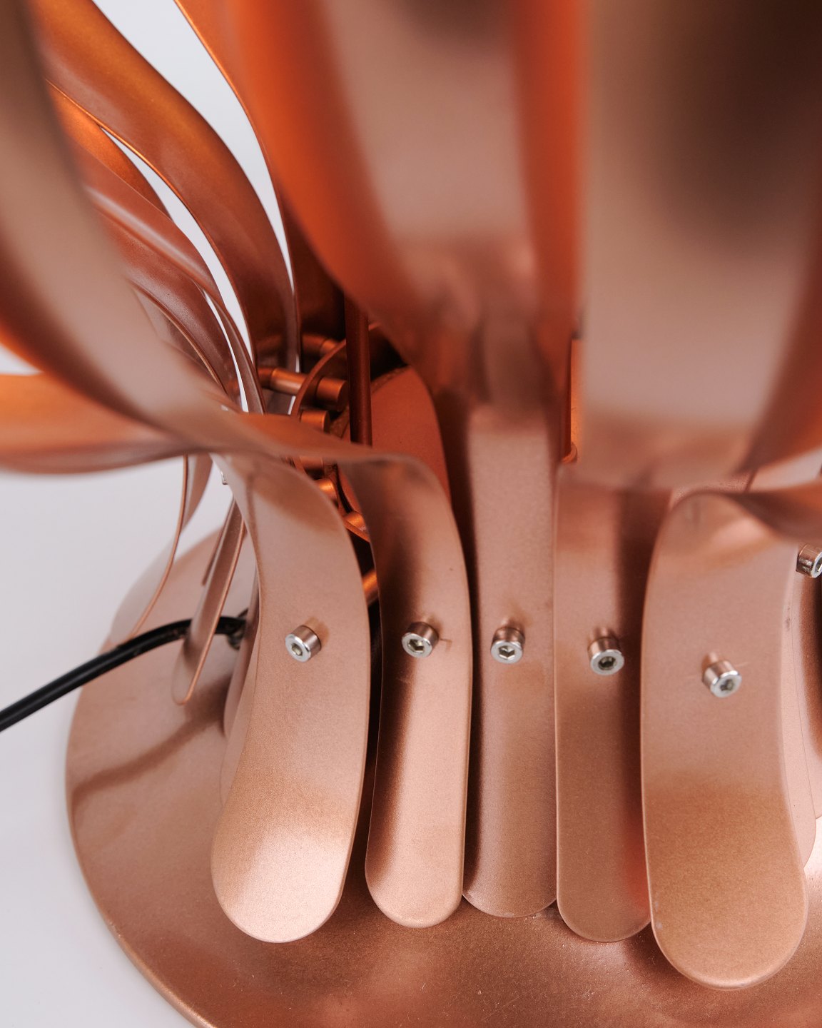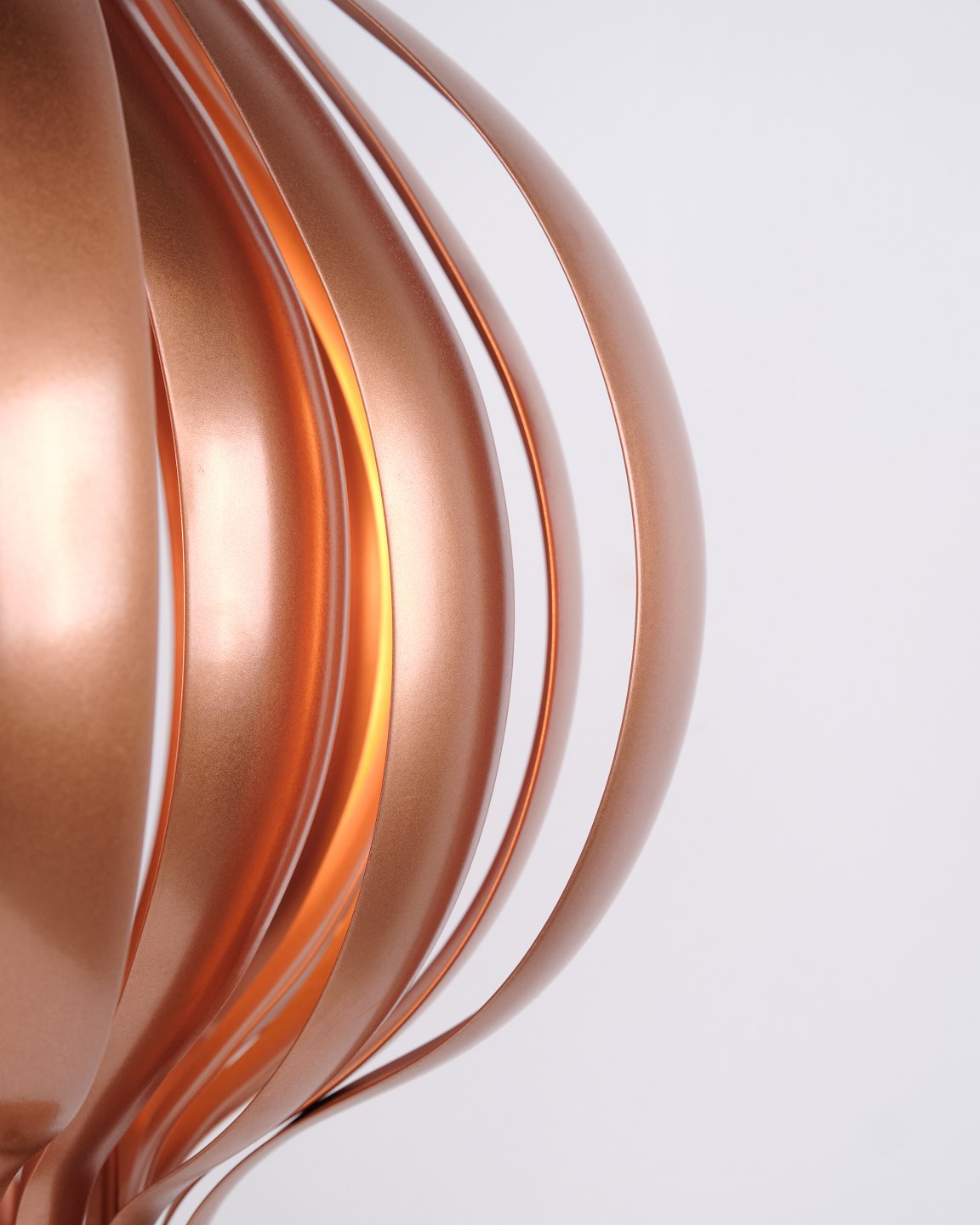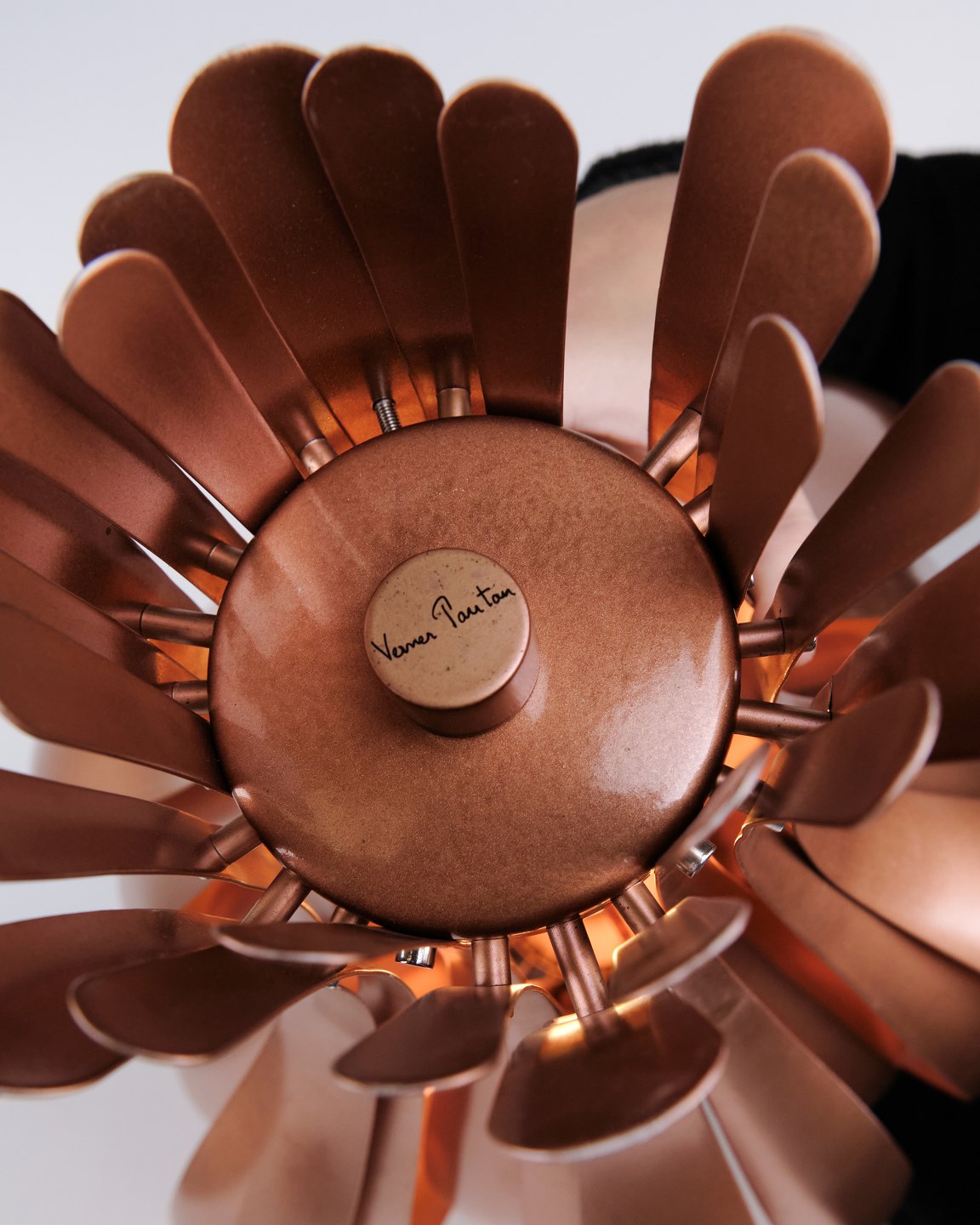 Seltene Onion Tischlampe, entworfen von Verner Panton in den 1970er Jahren. Die Lampe ist aus Kupfer gefertigt und zeichnet sich durch ihre organische, geschichtete Form aus, die einen skulpturalen und dekorativen Ausdruck schafft. Die Konstruktion erzeugt ein weiches und stimmungsvolles Licht, wobei die Reflexionen im Kupfer den Charakter der Lampe hervorheben.