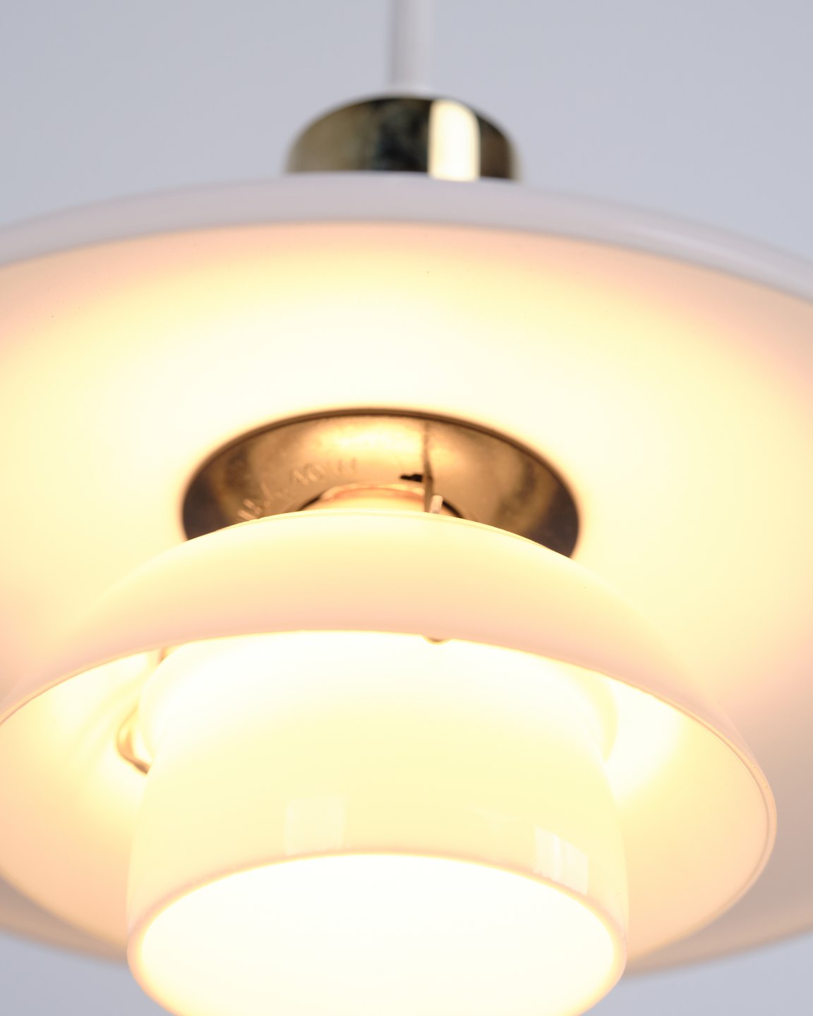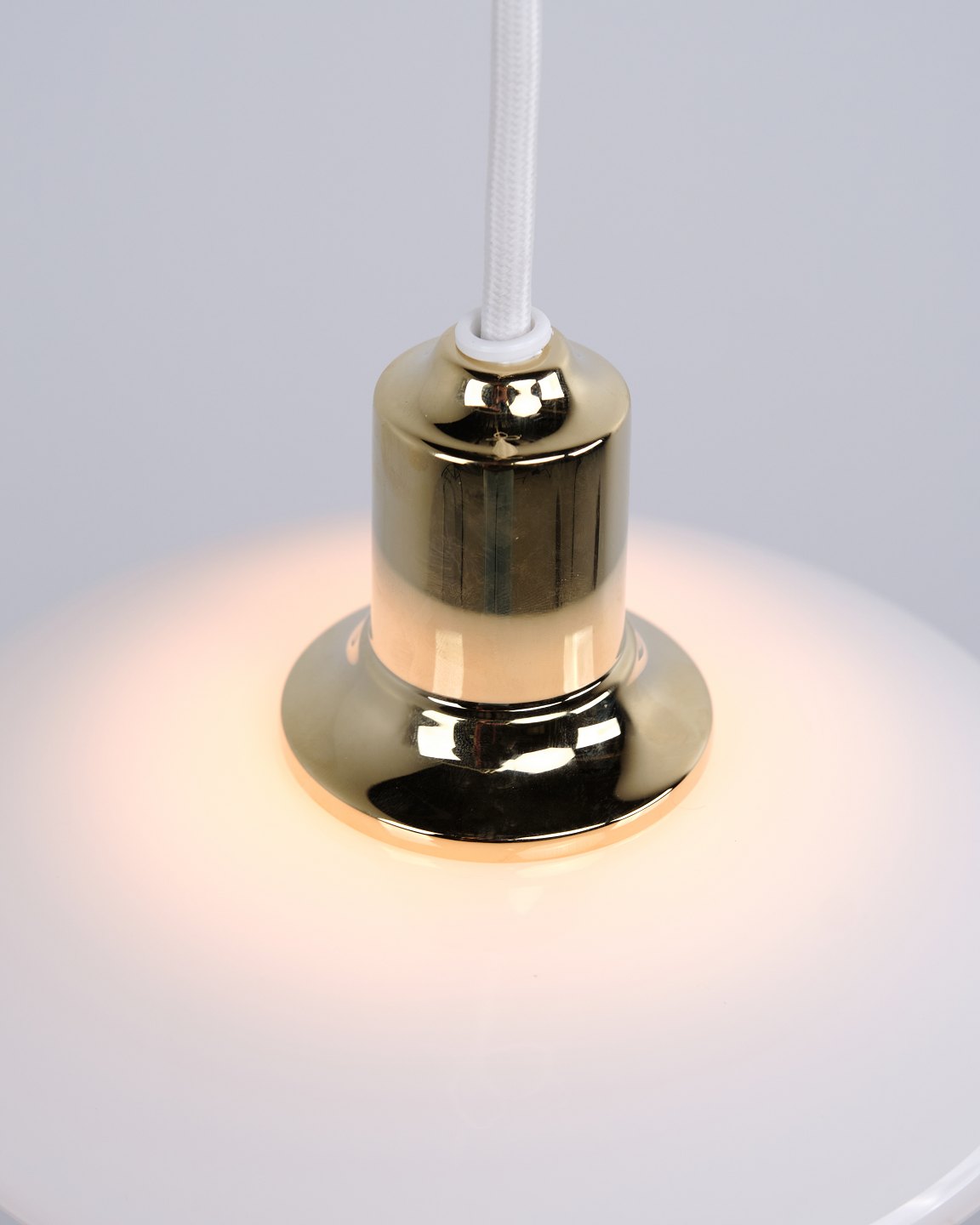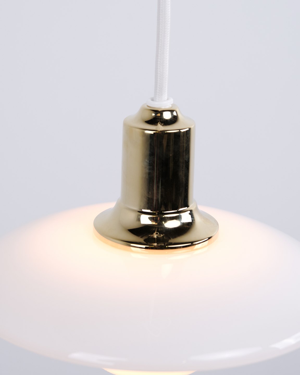PH 2/1 Pendelleuchte aus Messing mit Opalglas von Louis Poulsen. Entworfen von Poul Henningsen mit klassischem dänischem Lichtdesign und blendfreier Beleuchtung.