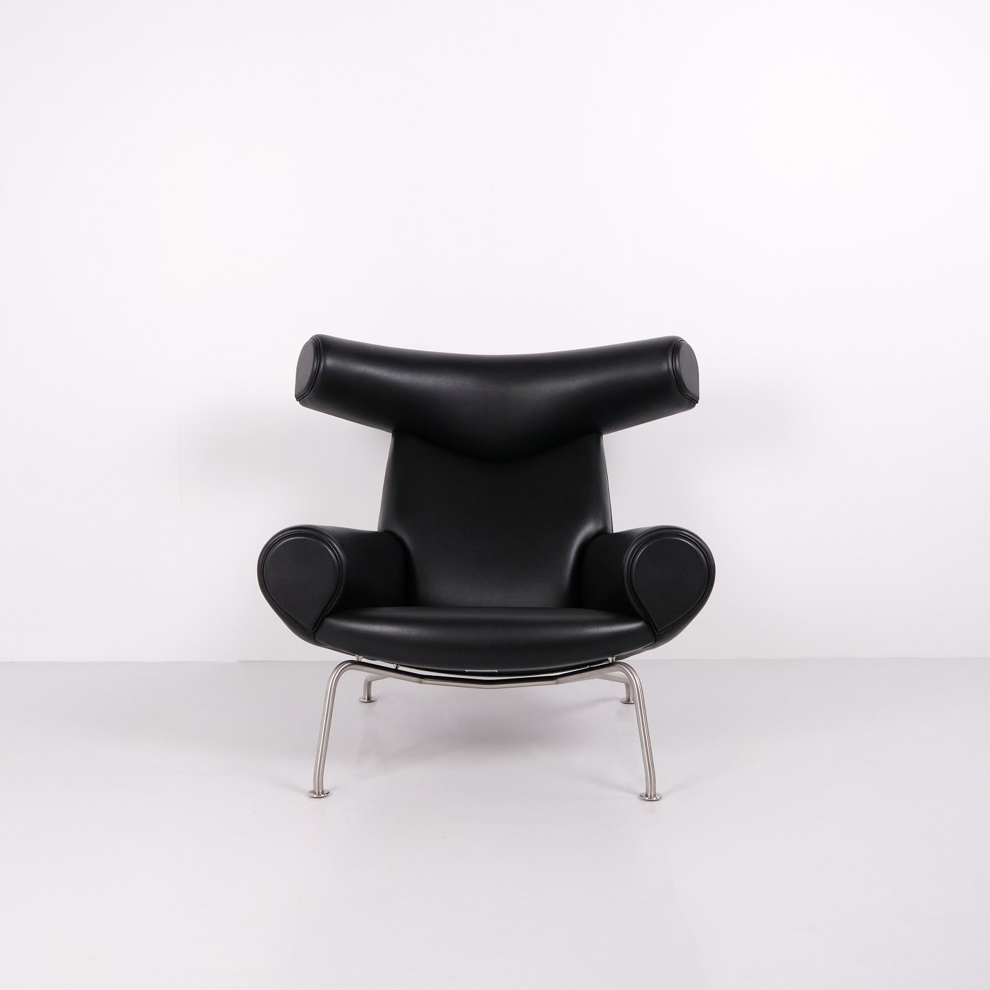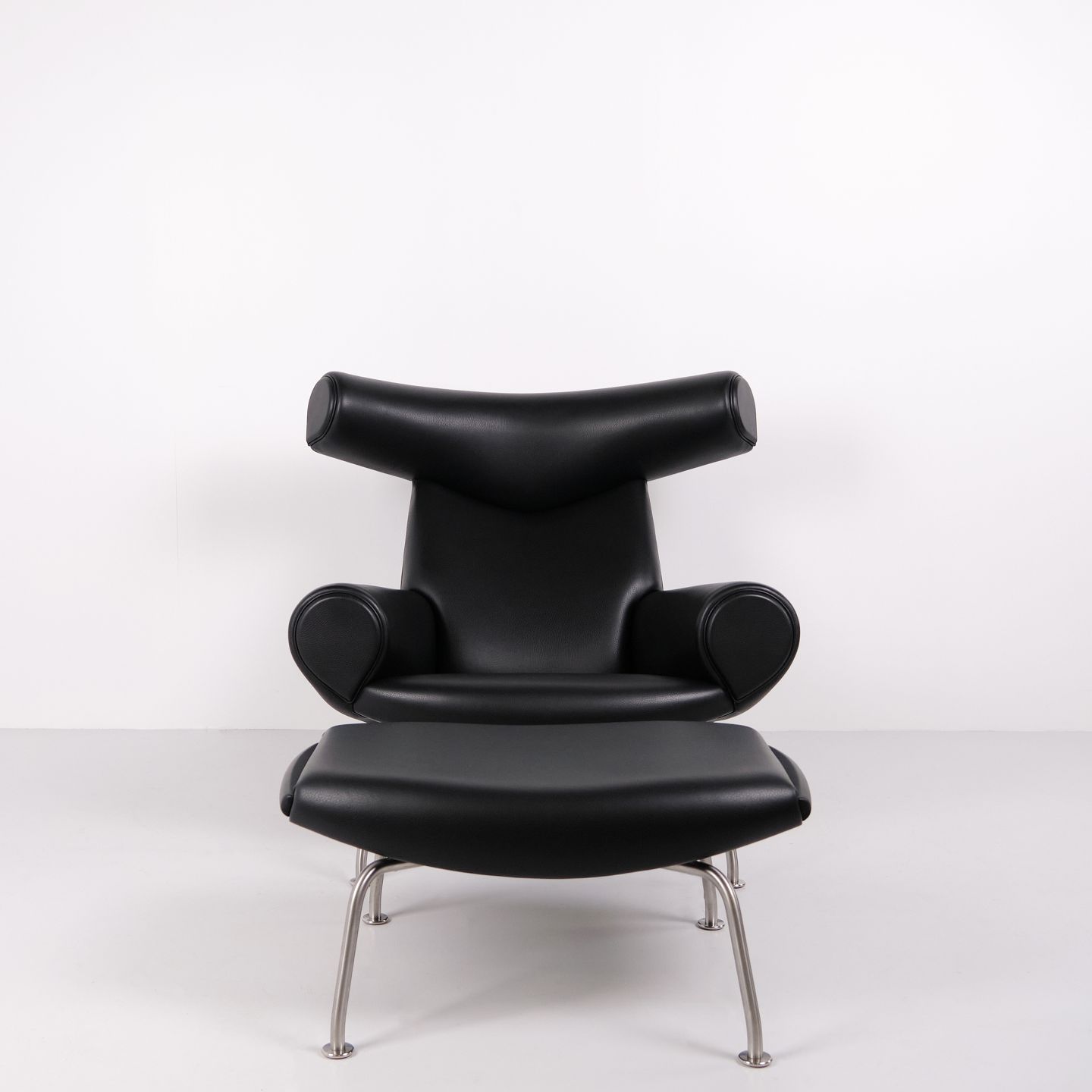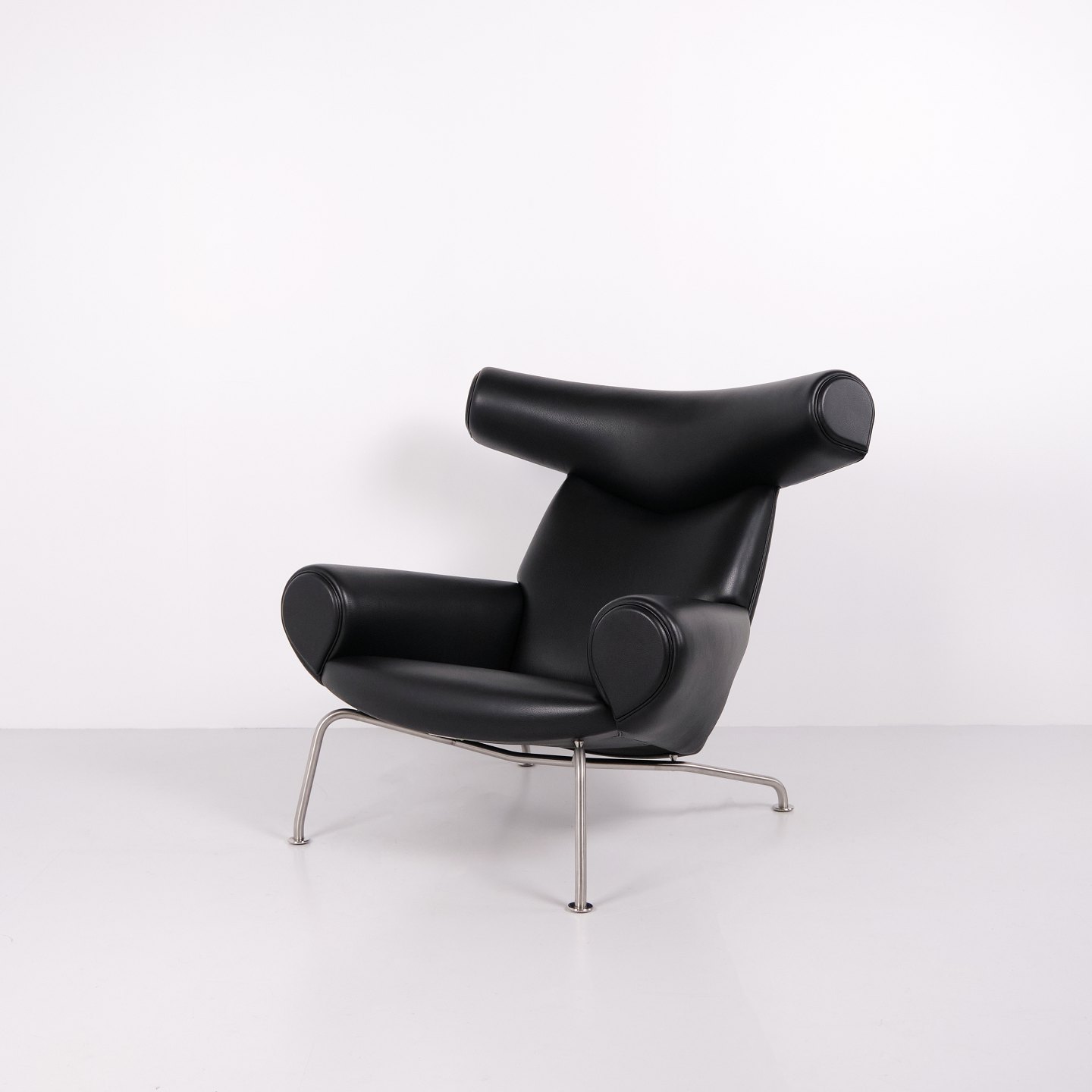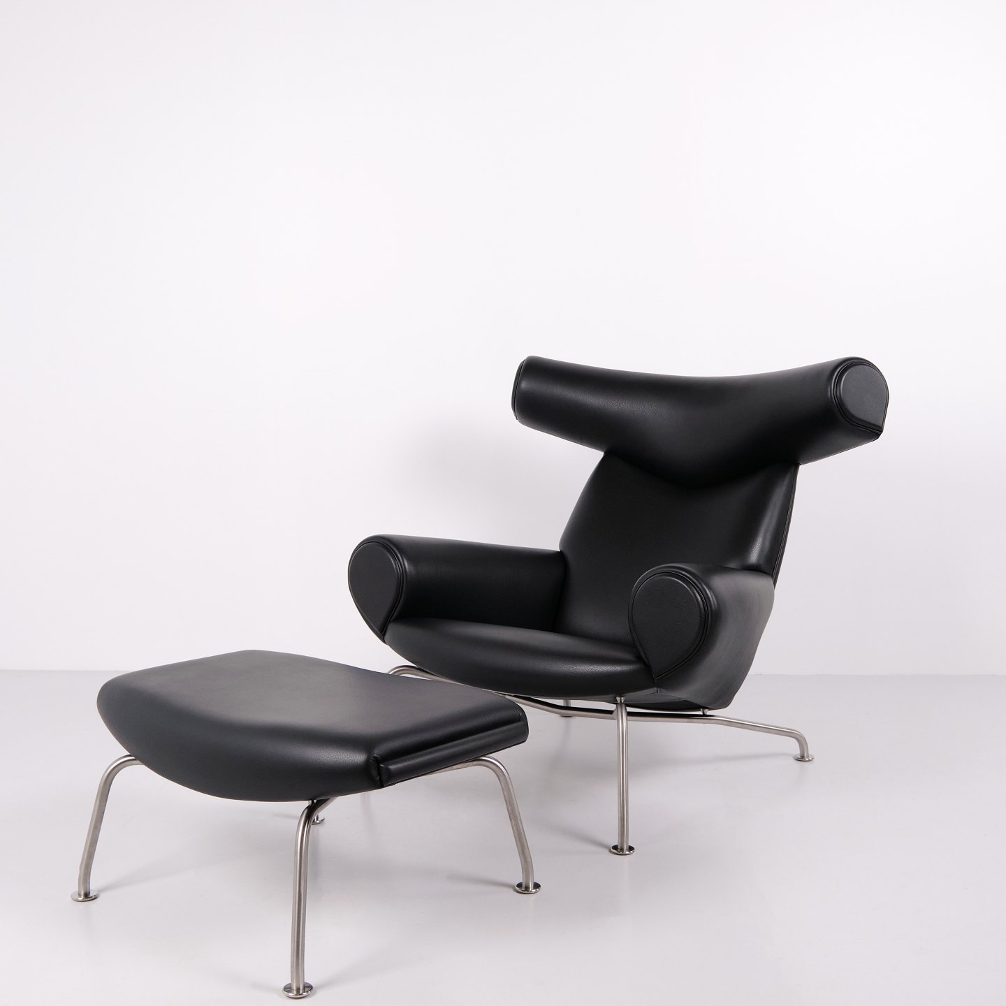 Ox Chair Modell EJ100 mit passendem Hocker, entworfen von Hans J. Wegner. Das Modell wurde 1960 entworfen und wird heute von Fredericia Furniture nach der Übernahme von Erik Jørgensen produziert. Aus schwarzem Leder mit Stahlgestell gefertigt. Die markante Rückenlehne mit „Hörnern“ gab dem Sessel den Namen Ox Chair. Das Design gilt als eines der skulpturalsten Werke Wegners und unterscheidet sich von vielen seiner anderen Stühle durch seine kraftvolle organische Form. Der Ox Chair ist in internationalen Sammlungen vertreten und zählt zu den bekanntesten dänischen Loungesesseln seiner Zeit.