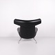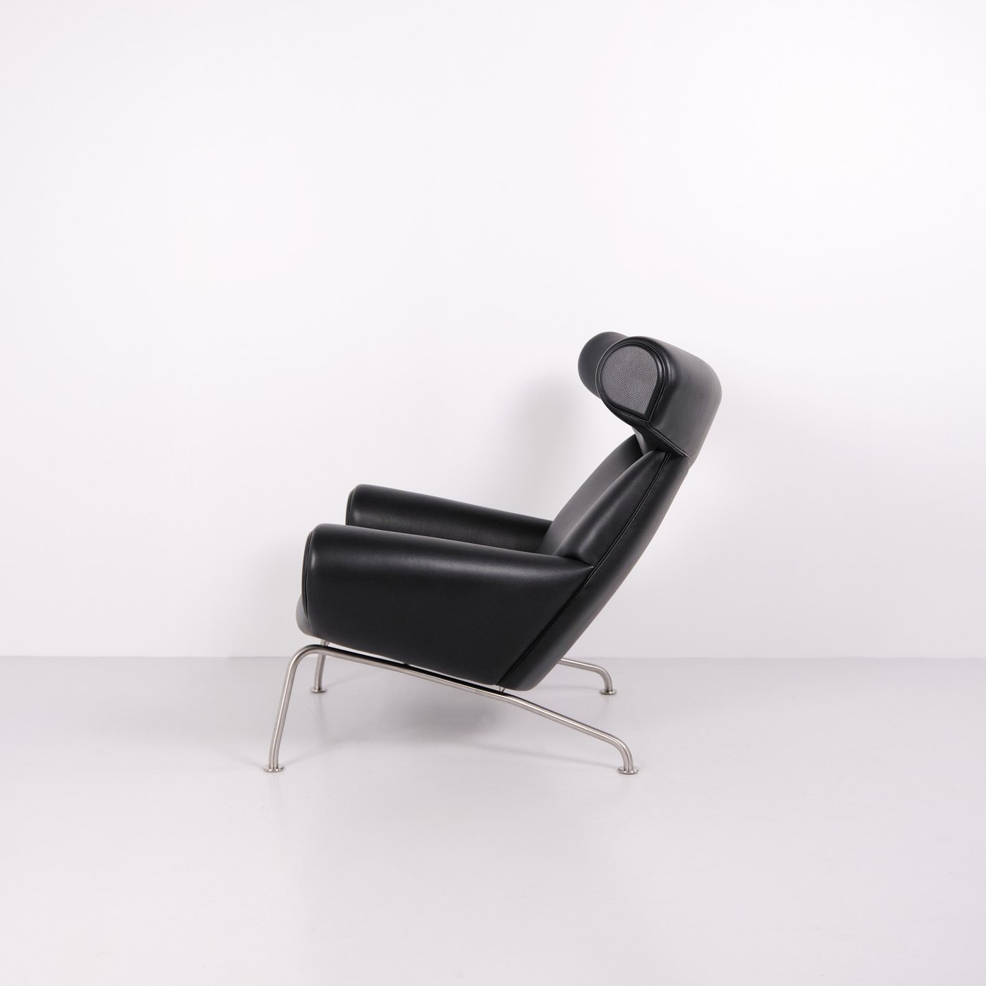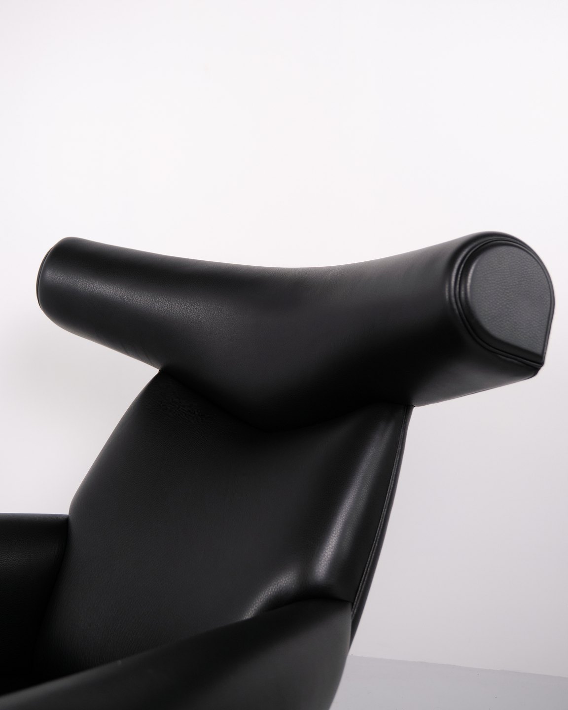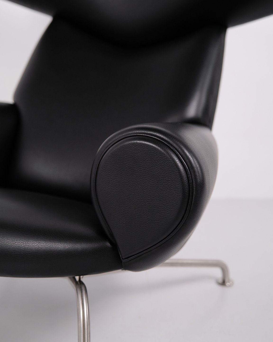 Ox Chair Modell EJ100 mit passendem Hocker, entworfen von Hans J. Wegner. Das Modell wurde 1960 entworfen und wird heute von Fredericia Furniture nach der Übernahme von Erik Jørgensen produziert. Aus schwarzem Leder mit Stahlgestell gefertigt. Die markante Rückenlehne mit „Hörnern“ gab dem Sessel den Namen Ox Chair. Das Design gilt als eines der skulpturalsten Werke Wegners und unterscheidet sich von vielen seiner anderen Stühle durch seine kraftvolle organische Form. Der Ox Chair ist in internationalen Sammlungen vertreten und zählt zu den bekanntesten dänischen Loungesesseln seiner Zeit.