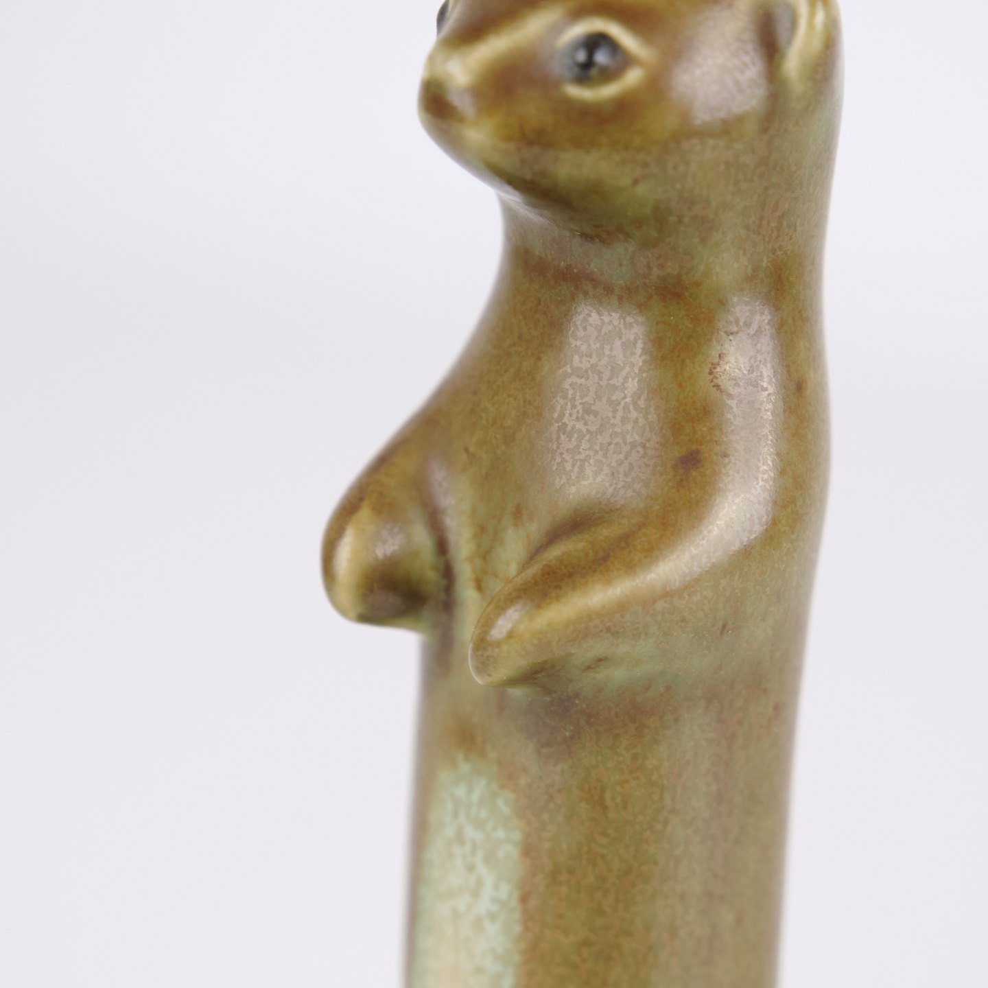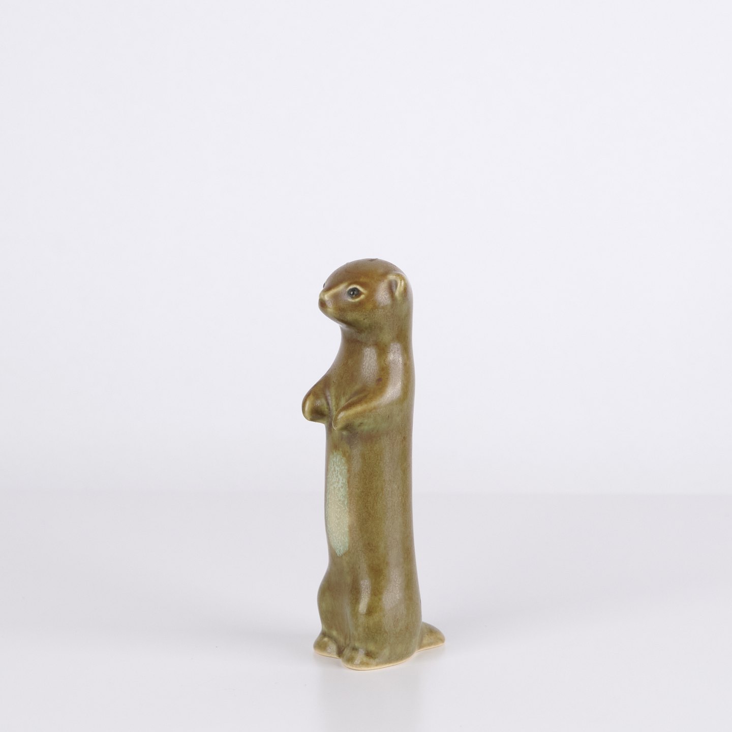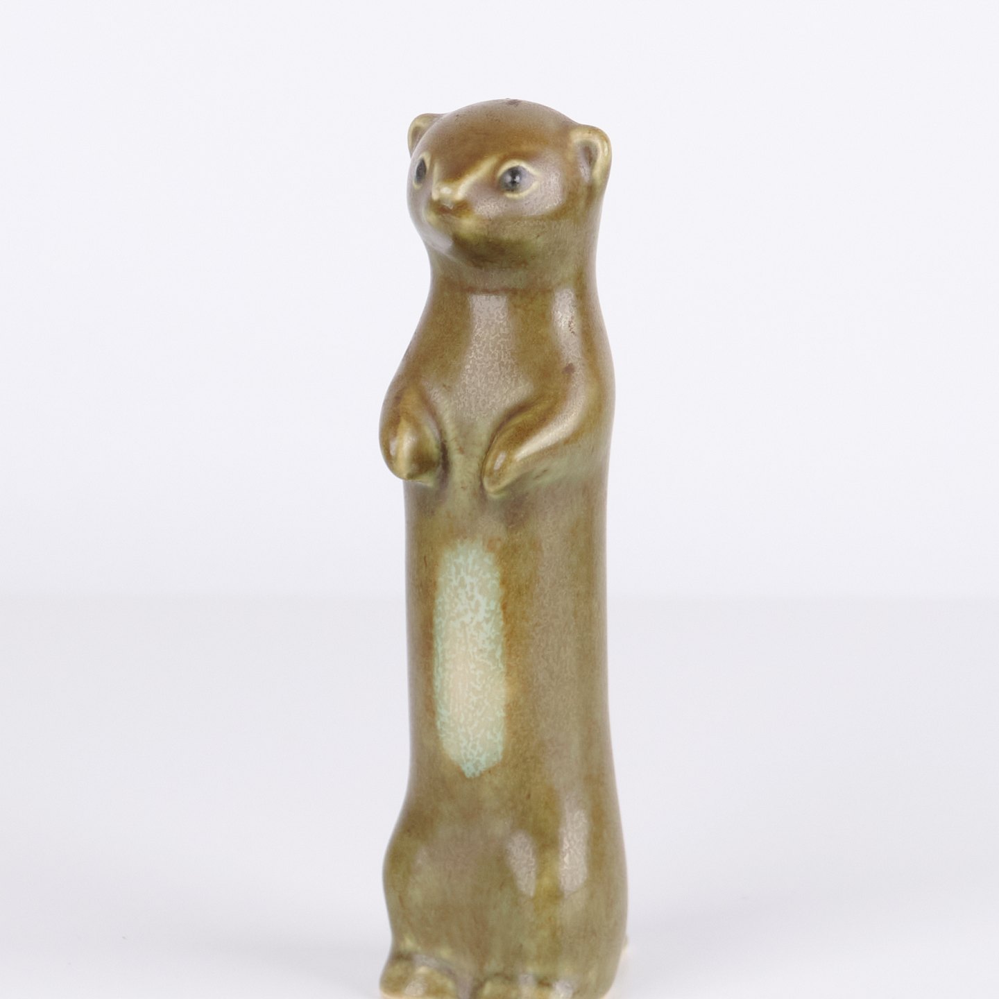 Tierfigur von Knud Basse aus glasierter Keramik. Die Figur stellt ein Frettchen oder Hermelin dar und wurde in den 1960er Jahren in Dänemark hergestellt. Knud Basse ist bekannt für keramische Tierfiguren mit Naturmotiven sowie kleinere Serien aus dieser Zeit.