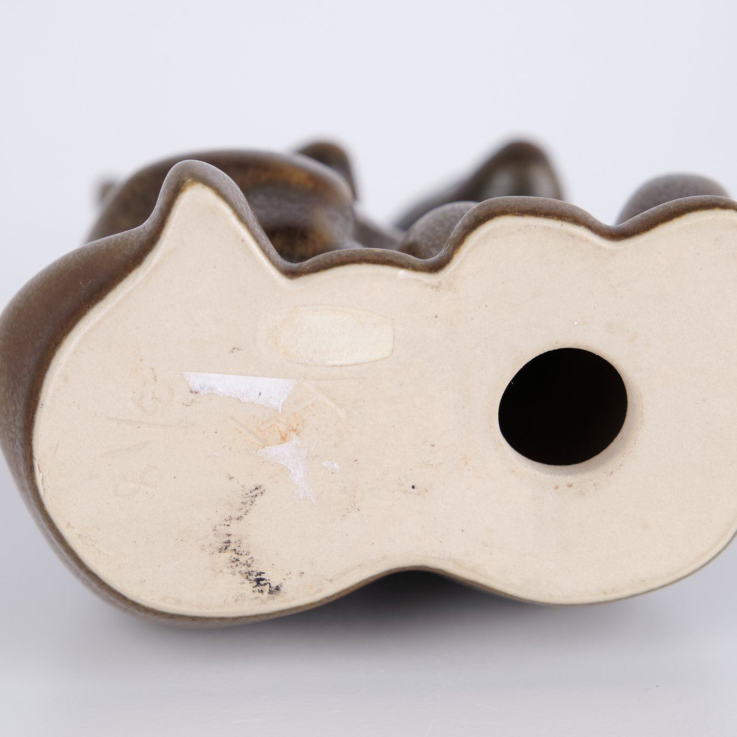 Große Doppelfigur von Knud Basse aus braun glasierter Keramik. Das Modell zeigt zwei dicht nebeneinander sitzende Bären mit hervorgehobenen hellen Brustdetails. Eine größere und seltenere Figur aus Knud Basses Tierserie, hergestellt in Dänemark in den 1960er Jahren.