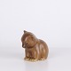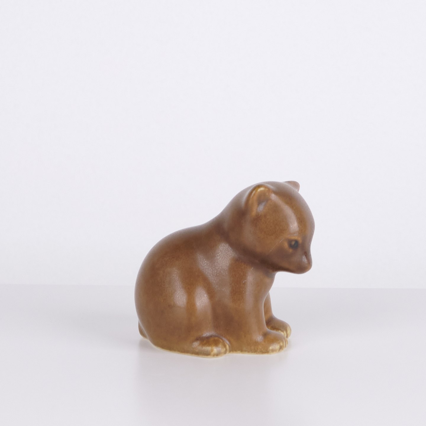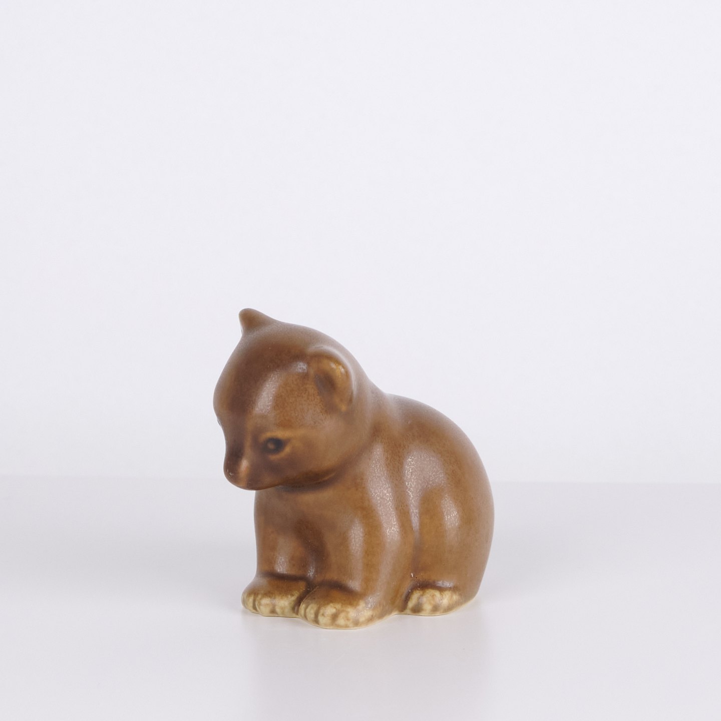 Bärenfigur von Knud Basse aus hellbraun glasierter Keramik. Die Figur zeigt einen sitzenden Bären mit gesenktem Kopf, markierten Pfoten und weichen organischen Formen. Ein klassisches kleineres Modell aus Knud Basses Serie von Tierfiguren, hergestellt in Dänemark in den 1960er Jahren.