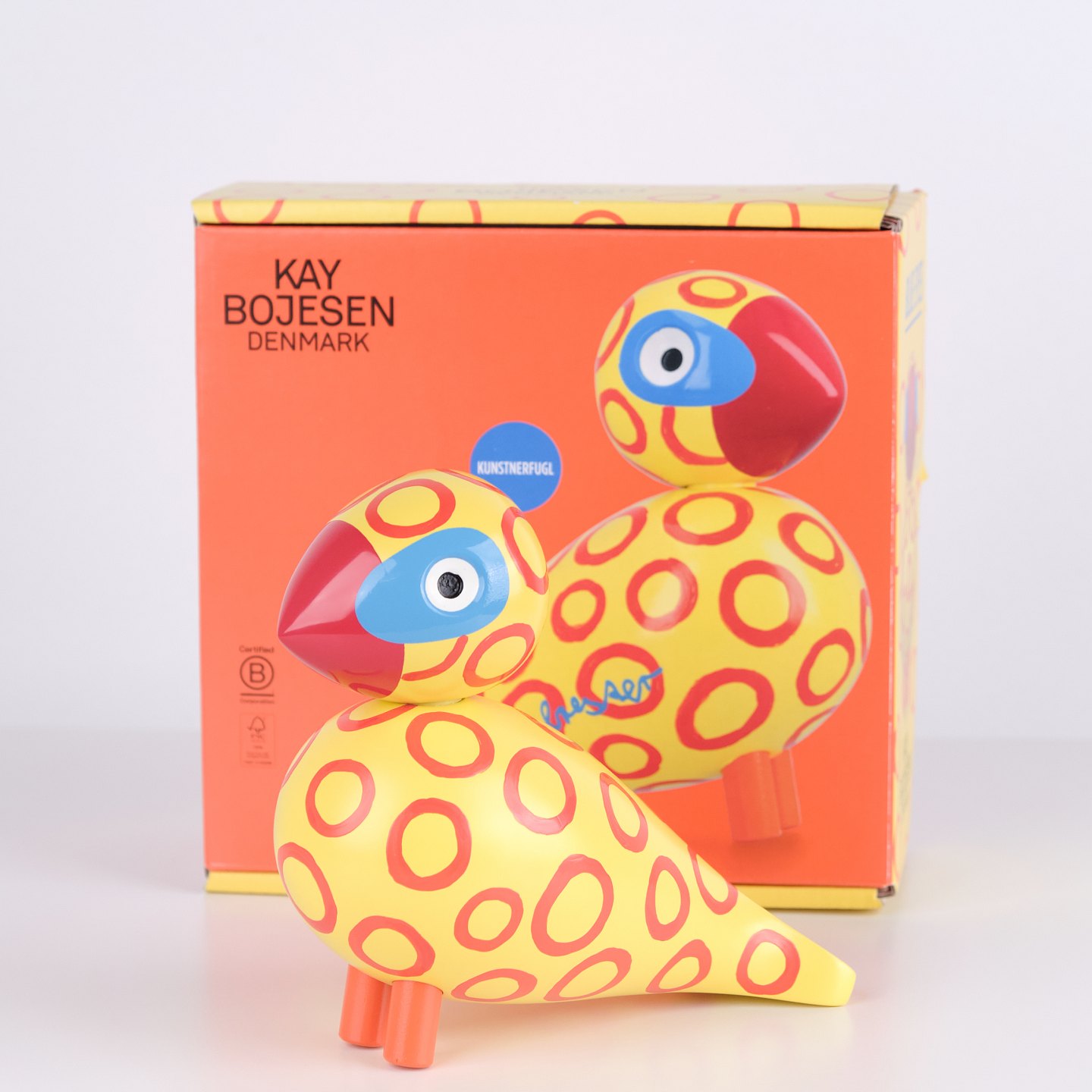 Singvogel Blue Eyes entstanden als Zusammenarbeit zwischen Kay Bojesen und Leif Sylvester. Die Figur ist aus bemaltem Holz mit mehrfarbiger Dekoration und Blue Eyes Motiv gefertigt. Die Serie führt Kay Bojesens bekannte Holzfiguren weiter und verbindet klassisches dänisches Design mit dem farbenfrohen Universum von Leif Sylvester. Ein dekoratives Sammlerstück und ein schönes Beispiel moderner Interpretation dänischer Designtradition.