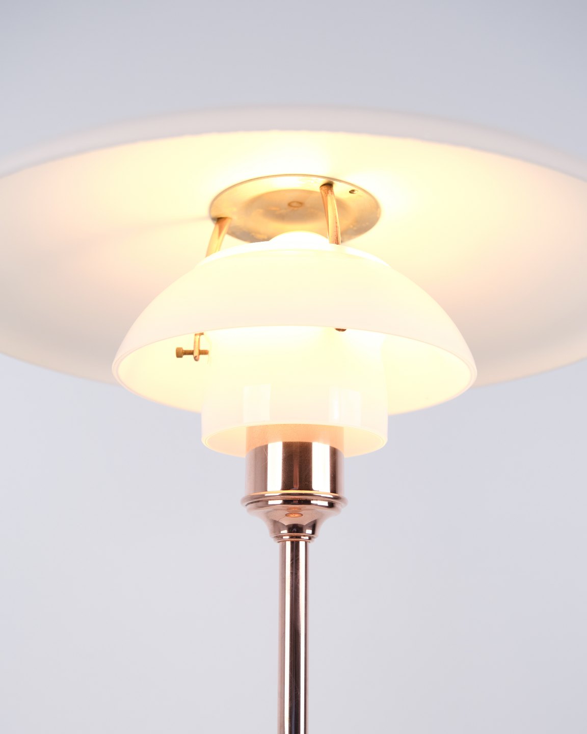 PH Tischlampe Modell PH 3½-2½ Limited Edition, entworfen von Poul Henningsen und hergestellt von Louis Poulsen. Die Lampe ist aus Kupfer gefertigt mit oberem Schirm aus weißem Opalglas sowie zwei unteren Schirmen aus weißem Opalglas. Das Modell wurde im Jahr 2015 nur für einen begrenzten Zeitraum verkauft.
